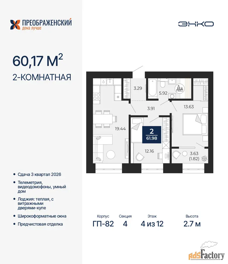 Дом монолитный, многоподъездный, переменной этажности, от 8 до 12 этажей. Квартира находится в 4-й секции высотой 12 этажей в корпусе ГП-82. На этаже 6 квартир. В подъезде 1 пассажирский и 1 грузовой лифт. Окончание строительства - 3 квартал 2026 года. Оформление сделки по договору долевого участия.