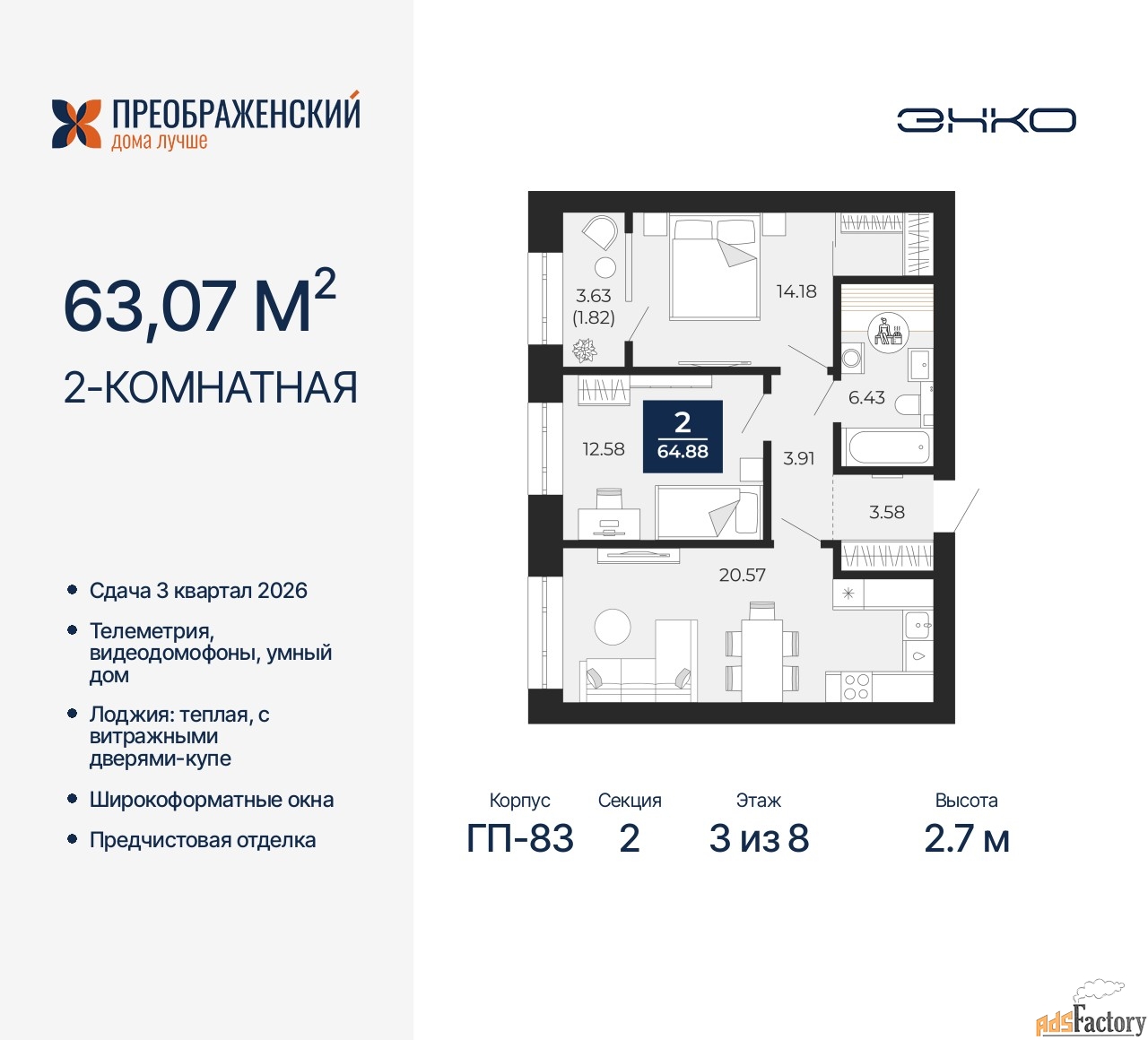 Дом монолитный, многоподъездный, переменной этажности, от 8 до 12 этажей. Квартира находится во 2-й секции высотой 8 этажей в корпусе ГП-83. На этаже 6 квартир. В подъезде 1 грузовой лифт. Начало строительства - 4 квартал 2023 года. Окончание строительства - 3 квартал 2026 года. Оформление сделки по договору долевого участия.