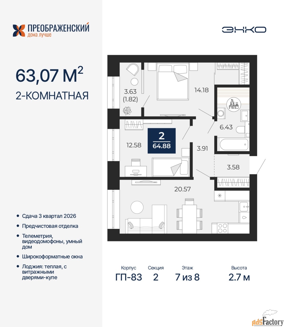 Дом монолитный, многоподъездный, переменной этажности, от 8 до 12 этажей. Квартира находится во 2-й секции высотой 8 этажей в корпусе ГП-83. На этаже 6 квартир. В подъезде 1 грузовой лифт. Начало строительства - 4 квартал 2023 года. Окончание строительства - 3 квартал 2026 года. Оформление сделки по договору долевого участия.