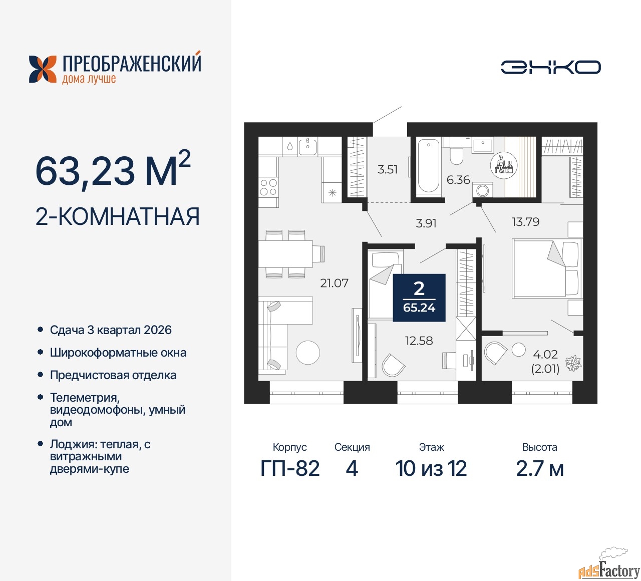 Дом монолитный, многоподъездный, переменной этажности, от 8 до 12 этажей. Квартира находится в 4-й секции высотой 12 этажей в корпусе ГП-82. На этаже 6 квартир. В подъезде 1 пассажирский и 1 грузовой лифт. Окончание строительства - 3 квартал 2026 года. Оформление сделки по договору долевого участия.