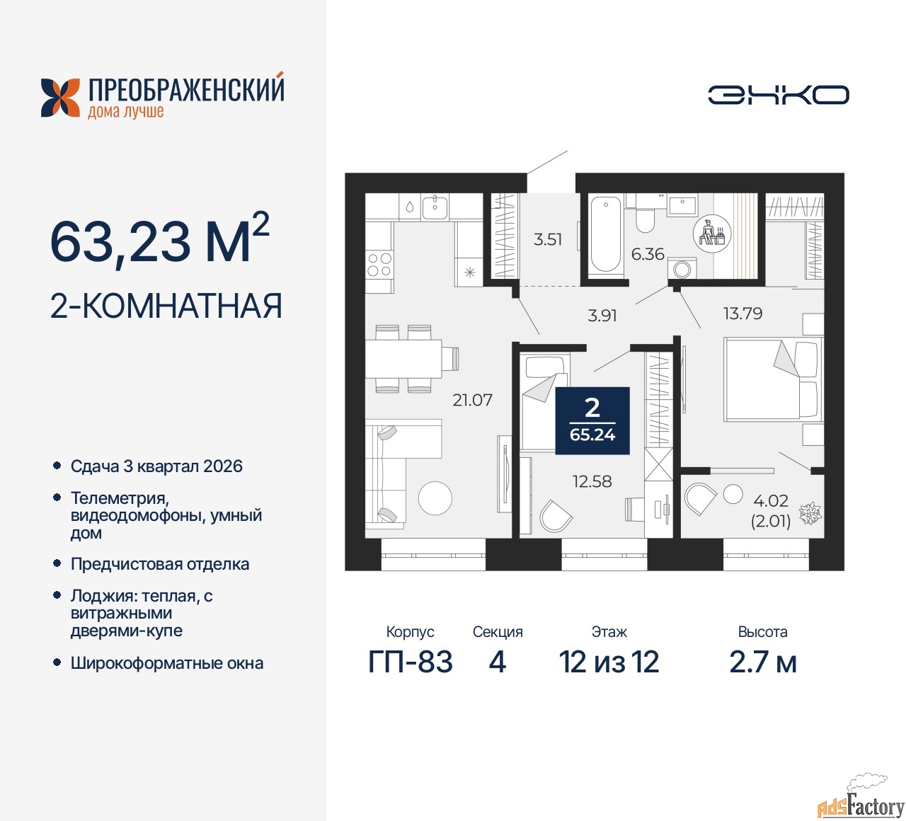 Дом монолитный, многоподъездный, переменной этажности, от 8 до 12 этажей. Квартира находится в 4-й секции высотой 12 этажей в корпусе ГП-83. На этаже 6 квартир. В подъезде 1 пассажирский и 1 грузовой лифт. Начало строительства - 4 квартал 2023 года. Окончание строительства - 3 квартал 2026 года. Оформление сделки по договору долевого участия.