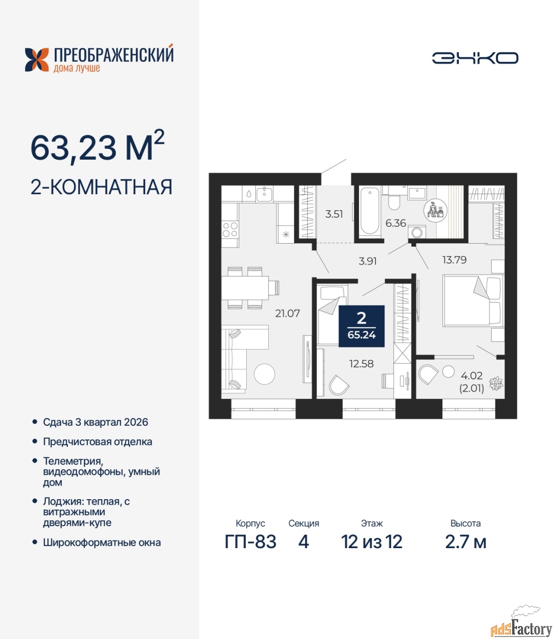 Дом монолитный, многоподъездный, переменной этажности, от 8 до 12 этажей. Квартира находится в 4-й секции высотой 12 этажей в корпусе ГП-83. На этаже 6 квартир. В подъезде 1 пассажирский и 1 грузовой лифт. Начало строительства - 4 квартал 2023 года. Окончание строительства - 3 квартал 2026 года. Оформление сделки по договору долевого участия.