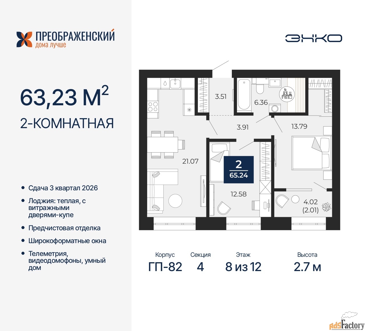Дом монолитный, многоподъездный, переменной этажности, от 8 до 12 этажей. Квартира находится в 4-й секции высотой 12 этажей в корпусе ГП-82. На этаже 6 квартир. В подъезде 1 пассажирский и 1 грузовой лифт. Окончание строительства - 3 квартал 2026 года. Оформление сделки по договору долевого участия.
