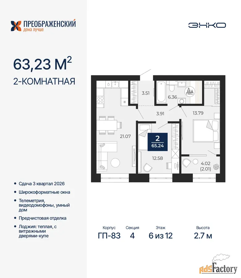 Дом монолитный, многоподъездный, переменной этажности, от 8 до 12 этажей. Квартира находится в 4-й секции высотой 12 этажей в корпусе ГП-83. На этаже 6 квартир. В подъезде 1 пассажирский и 1 грузовой лифт. Начало строительства - 4 квартал 2023 года. Окончание строительства - 3 квартал 2026 года. Оформление сделки по договору долевого участия.