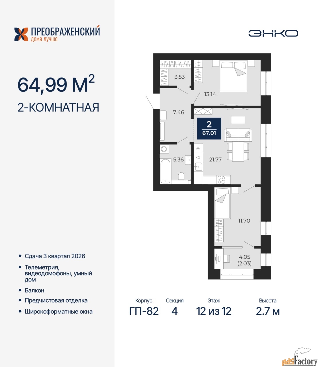 Дом монолитный, многоподъездный, переменной этажности, от 8 до 12 этажей. Квартира находится в 4-й секции высотой 12 этажей в корпусе ГП-82. На этаже 6 квартир. В подъезде 1 пассажирский и 1 грузовой лифт. Окончание строительства - 3 квартал 2026 года. Оформление сделки по договору долевого участия.