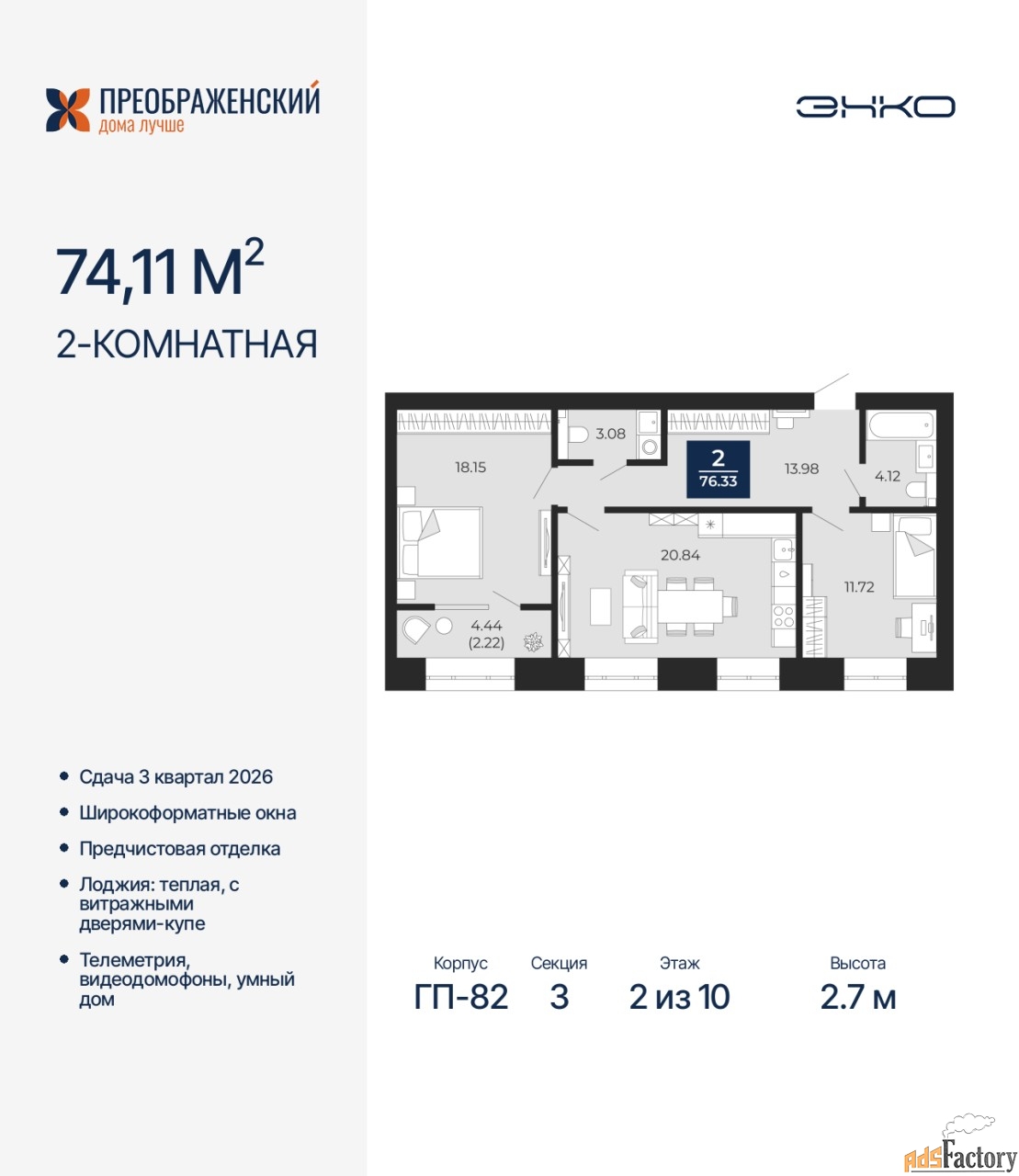 Дом монолитный, многоподъездный, переменной этажности, от 8 до 12 этажей. Квартира находится в 3-й секции высотой 10 этажей в корпусе ГП-82. На этаже 4 квартиры. В подъезде 1 пассажирский и 1 грузовой лифт. Окончание строительства - 3 квартал 2026 года. Оформление сделки по договору долевого участия.