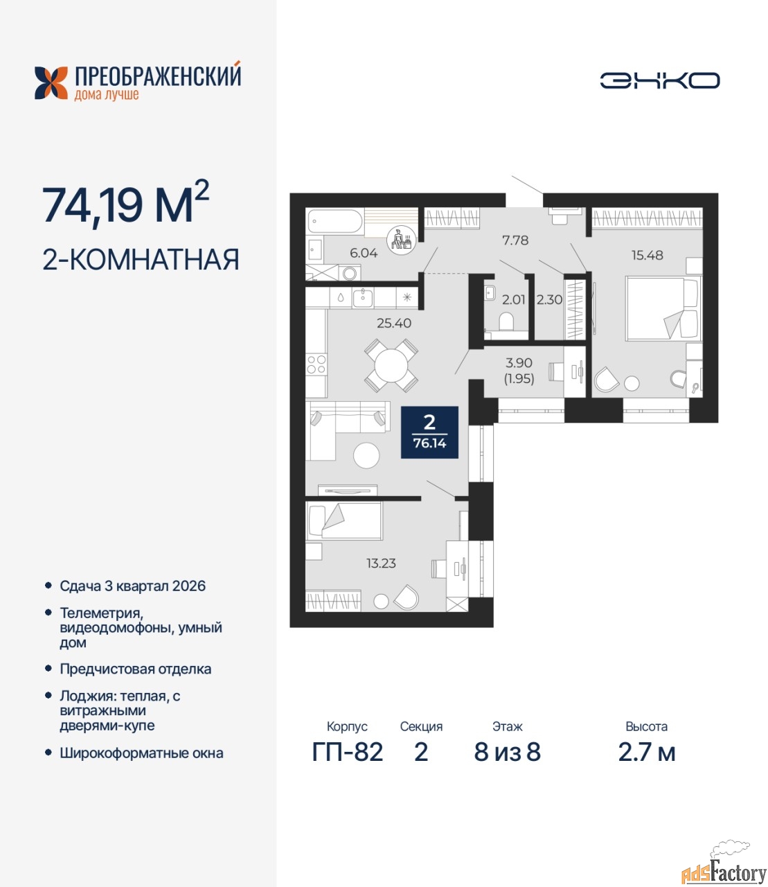 Дом монолитный, многоподъездный, переменной этажности, от 8 до 12 этажей. Квартира находится во 2-й секции высотой 8 этажей в корпусе ГП-82. На этаже 6 квартир. В подъезде 1 пассажирский и 1 грузовой лифт. Окончание строительства - 3 квартал 2026 года. Оформление сделки по договору долевого участия.