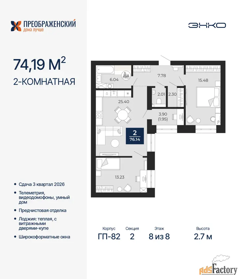 Дом монолитный, многоподъездный, переменной этажности, от 8 до 12 этажей. Квартира находится во 2-й секции высотой 8 этажей в корпусе ГП-82. На этаже 6 квартир. В подъезде 1 пассажирский и 1 грузовой лифт. Окончание строительства - 3 квартал 2026 года. Оформление сделки по договору долевого участия.