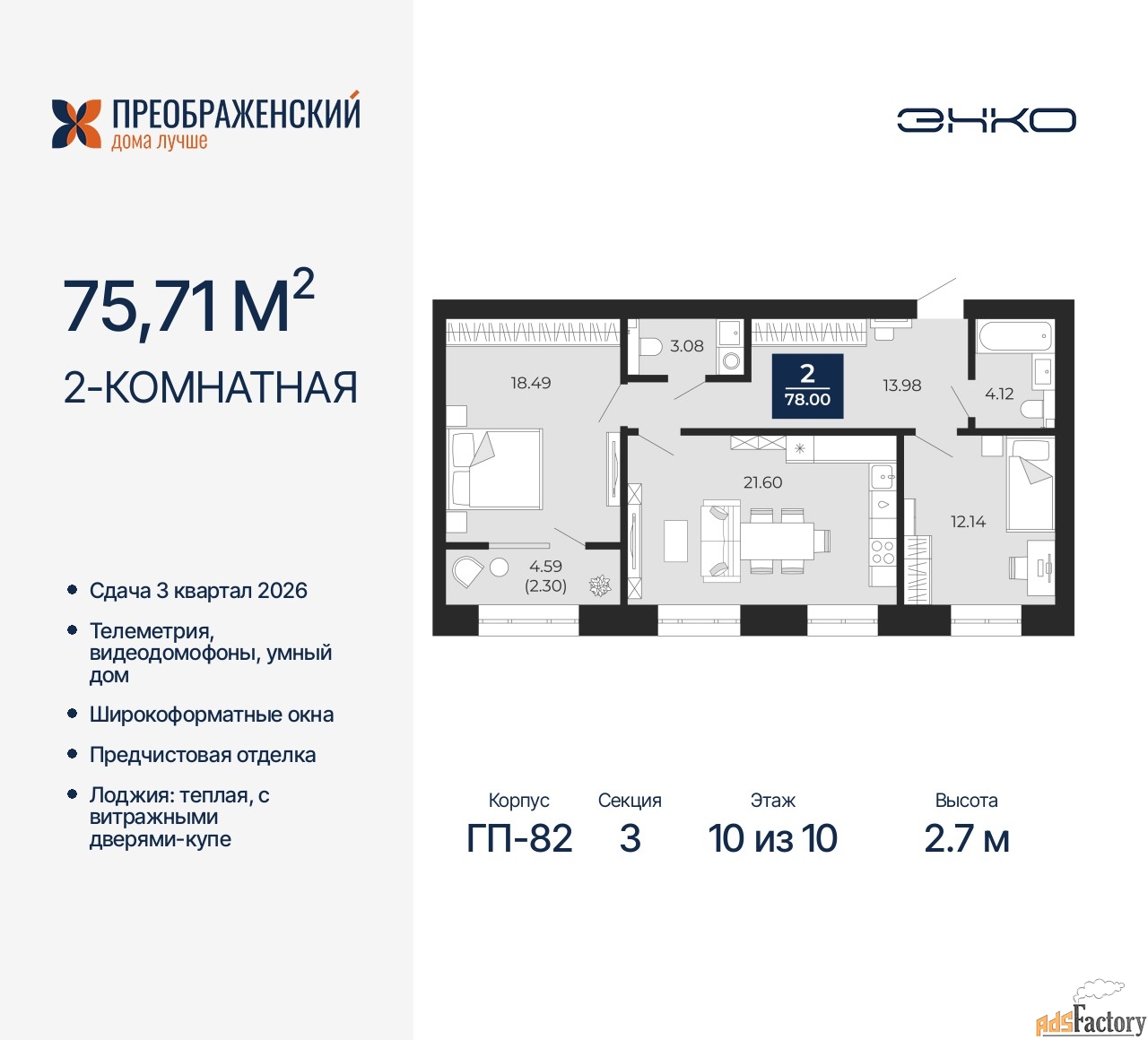 Дом монолитный, многоподъездный, переменной этажности, от 8 до 12 этажей. Квартира находится в 3-й секции высотой 10 этажей в корпусе ГП-82. На этаже 4 квартиры. В подъезде 1 пассажирский и 1 грузовой лифт. Окончание строительства - 3 квартал 2026 года. Оформление сделки по договору долевого участия.
