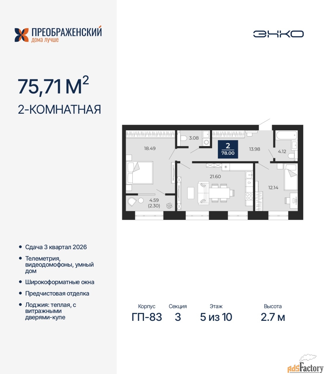 Дом монолитный, многоподъездный, переменной этажности, от 8 до 12 этажей. Квартира находится в 3-й секции высотой 10 этажей в корпусе ГП-83. На этаже 4 квартиры. В подъезде 1 пассажирский и 1 грузовой лифт. Начало строительства - 4 квартал 2023 года. Окончание строительства - 3 квартал 2026 года. Оформление сделки по договору долевого участия.