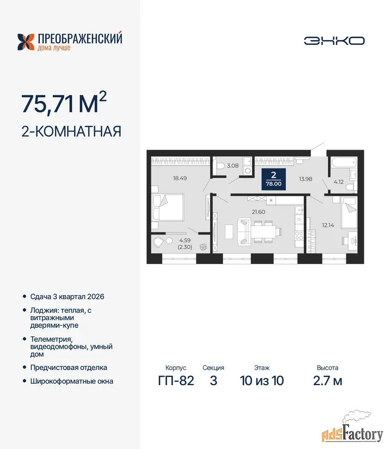 Дом монолитный, многоподъездный, переменной этажности, от 8 до 12 этажей. Квартира находится в 3-й секции высотой 10 этажей в корпусе ГП-82. На этаже 4 квартиры. В подъезде 1 пассажирский и 1 грузовой лифт. Окончание строительства - 3 квартал 2026 года. Оформление сделки по договору долевого участия.