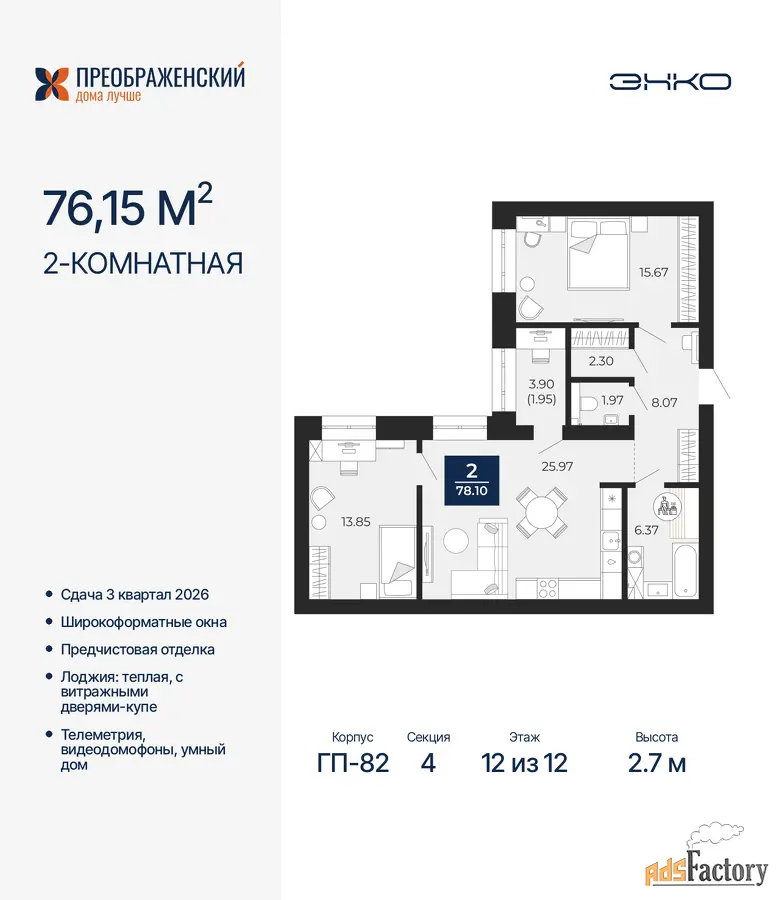 Дом монолитный, многоподъездный, переменной этажности, от 8 до 12 этажей. Квартира находится в 4-й секции высотой 12 этажей в корпусе ГП-82. На этаже 6 квартир. В подъезде 1 пассажирский и 1 грузовой лифт. Окончание строительства - 3 квартал 2026 года. Оформление сделки по договору долевого участия.