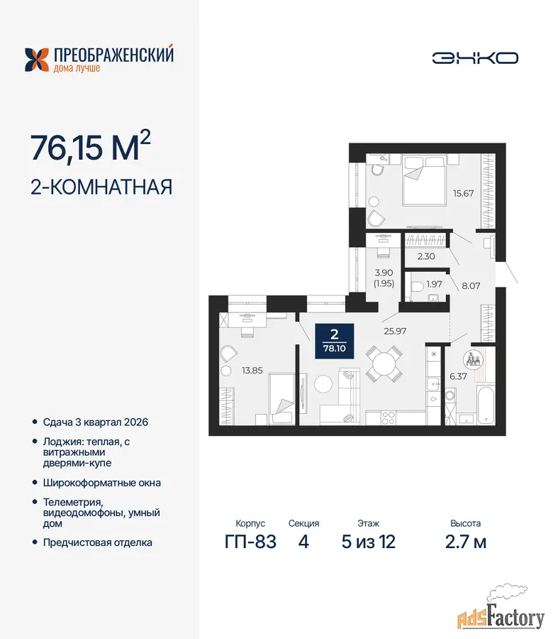 | Общая площадь (кв.м) | 76.15 |