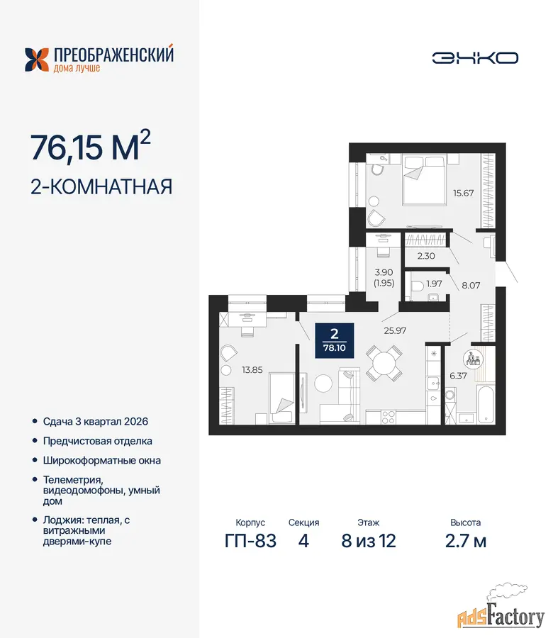 Дом монолитный, многоподъездный, переменной этажности, от 8 до 12 этажей. Квартира находится в 4-й секции высотой 12 этажей в корпусе ГП-83. На этаже 6 квартир. В подъезде 1 пассажирский и 1 грузовой лифт. Начало строительства - 4 квартал 2023 года. Окончание строительства - 3 квартал 2026 года. Оформление сделки по договору долевого участия.