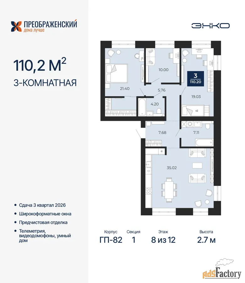 Дом монолитный, многоподъездный, переменной этажности, от 8 до 12 этажей. Квартира находится в 1-й секции высотой 12 этажей в корпусе ГП-82. На этаже 7 квартир. В подъезде 1 пассажирский и 1 грузовой лифт. Окончание строительства - 3 квартал 2026 года. Оформление сделки по договору долевого участия.