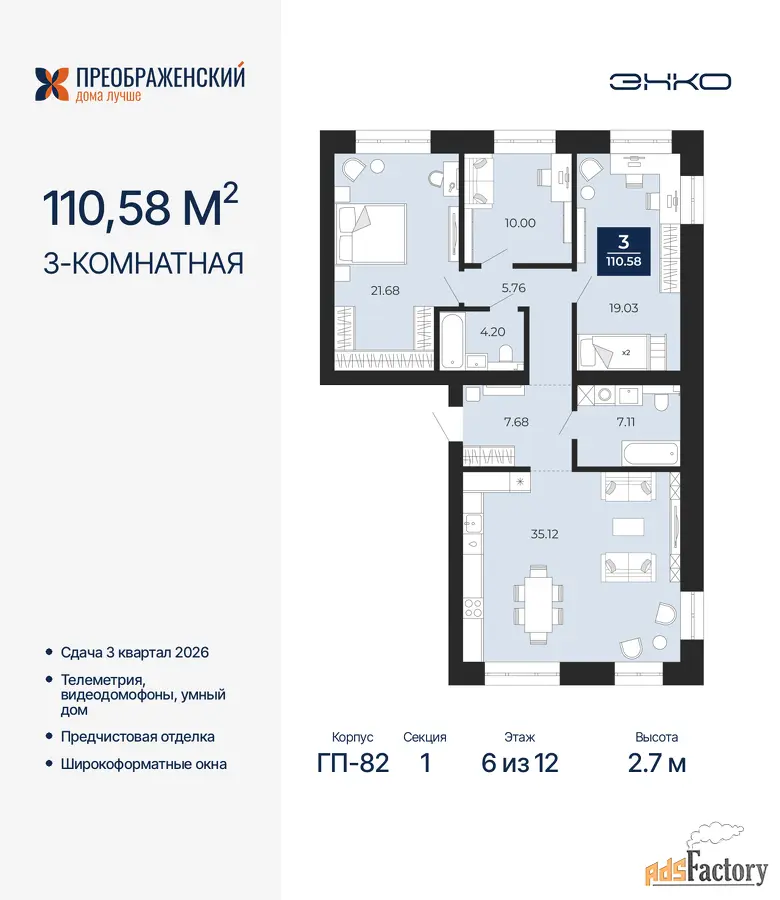 Дом монолитный, многоподъездный, переменной этажности, от 8 до 12 этажей. Квартира находится в 1-й секции высотой 12 этажей в корпусе ГП-82. На этаже 7 квартир. В подъезде 1 пассажирский и 1 грузовой лифт. Окончание строительства - 3 квартал 2026 года. Оформление сделки по договору долевого участия.