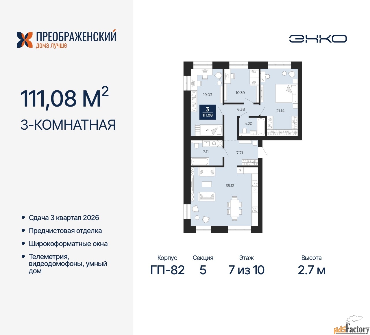 Дом монолитный, многоподъездный, переменной этажности, от 8 до 12 этажей. Квартира находится в 5-й секции высотой 10 этажей в корпусе ГП-82. На этаже 7 квартир. В подъезде 1 пассажирский и 1 грузовой лифт. Окончание строительства - 3 квартал 2026 года. Оформление сделки по договору долевого участия.
