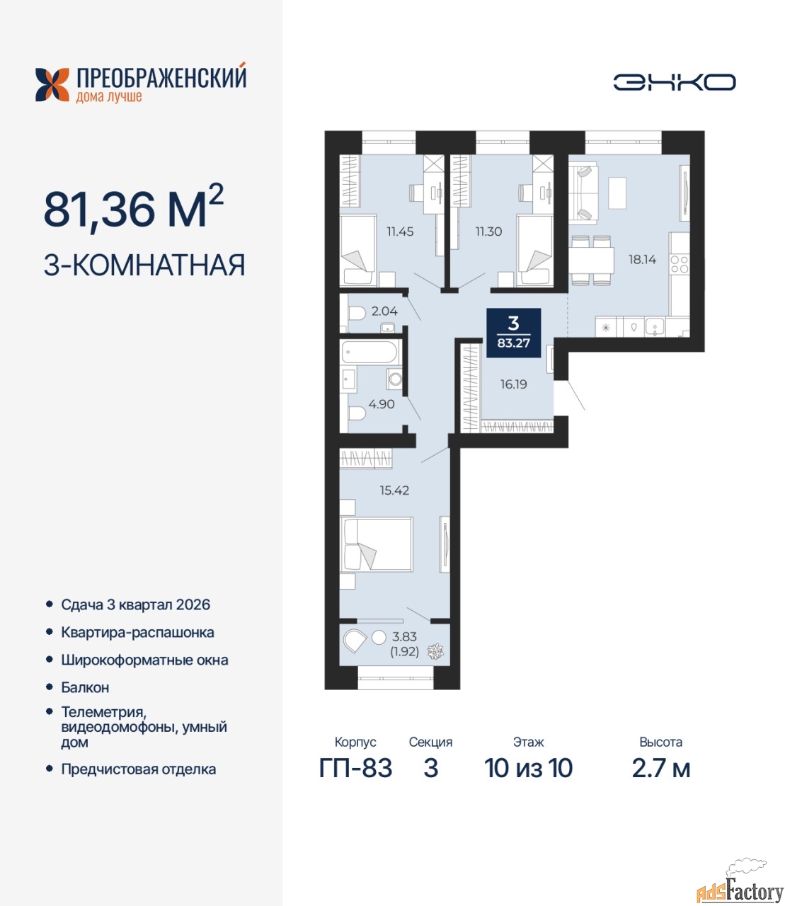 Дом монолитный, многоподъездный, переменной этажности, от 8 до 12 этажей. Квартира находится в 3-й секции высотой 10 этажей в корпусе ГП-83. На этаже 4 квартиры. В подъезде 1 пассажирский и 1 грузовой лифт. Начало строительства - 4 квартал 2023 года. Окончание строительства - 3 квартал 2026 года. Оформление сделки по договору долевого участия.