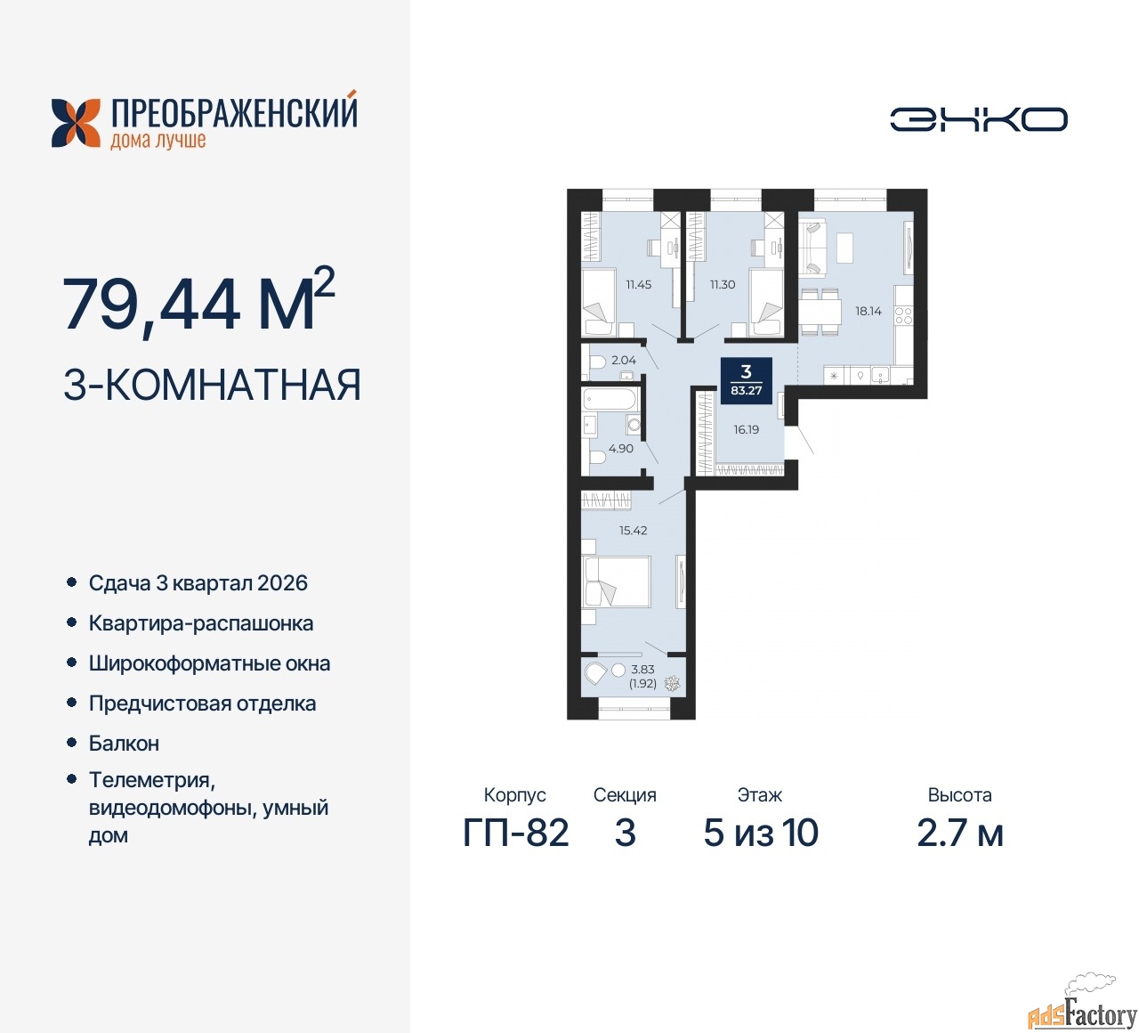 Дом монолитный, многоподъездный, переменной этажности, от 8 до 12 этажей. Квартира находится в 3-й секции высотой 10 этажей в корпусе ГП-82. На этаже 4 квартиры. В подъезде 1 пассажирский и 1 грузовой лифт. Окончание строительства - 3 квартал 2026 года. Оформление сделки по договору долевого участия.