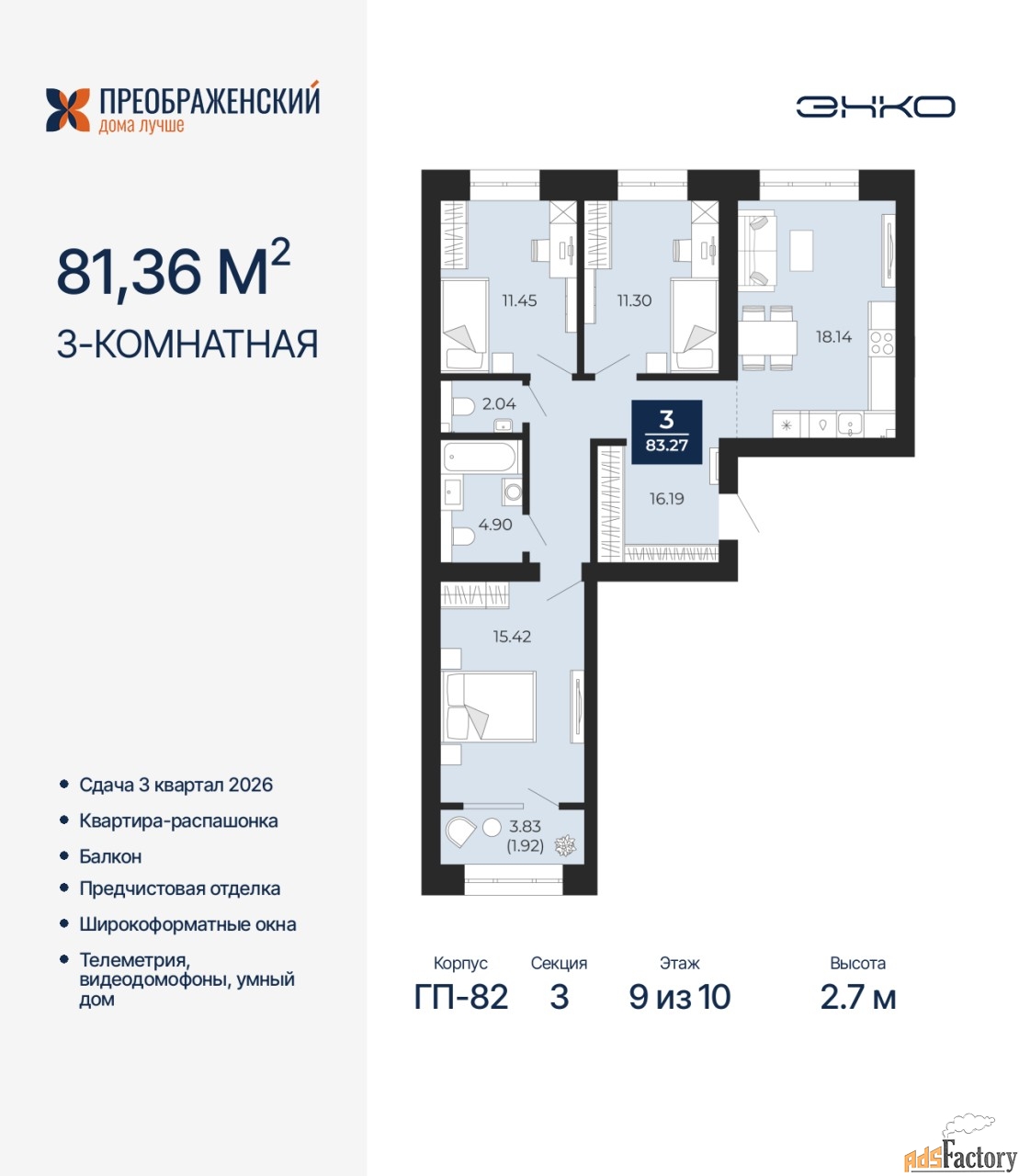 Дом монолитный, многоподъездный, переменной этажности, от 8 до 12 этажей. Квартира находится в 3-й секции высотой 10 этажей в корпусе ГП-82. На этаже 4 квартиры. В подъезде 1 пассажирский и 1 грузовой лифт. Окончание строительства - 3 квартал 2026 года. Оформление сделки по договору долевого участия.