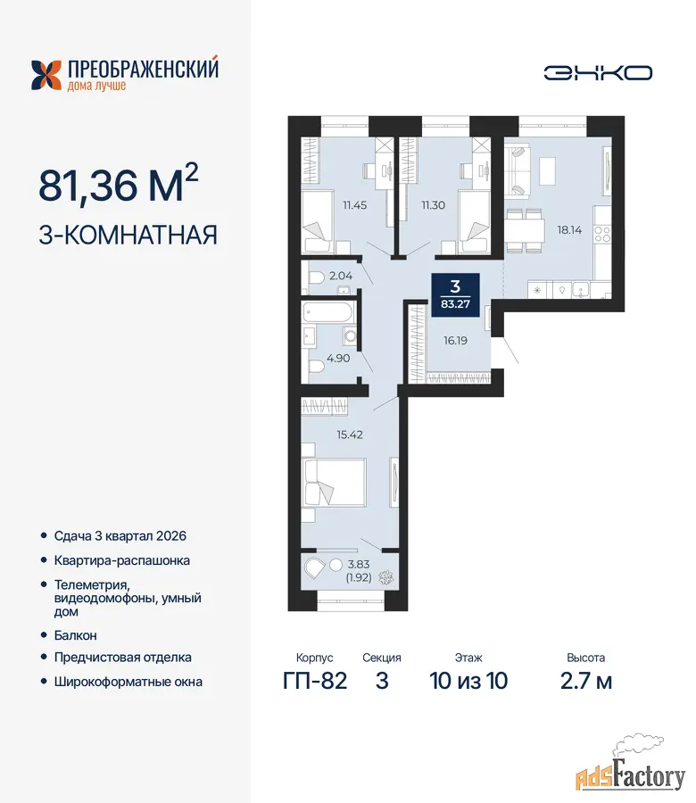 | Высота потолков (м.) | 2.7 |
