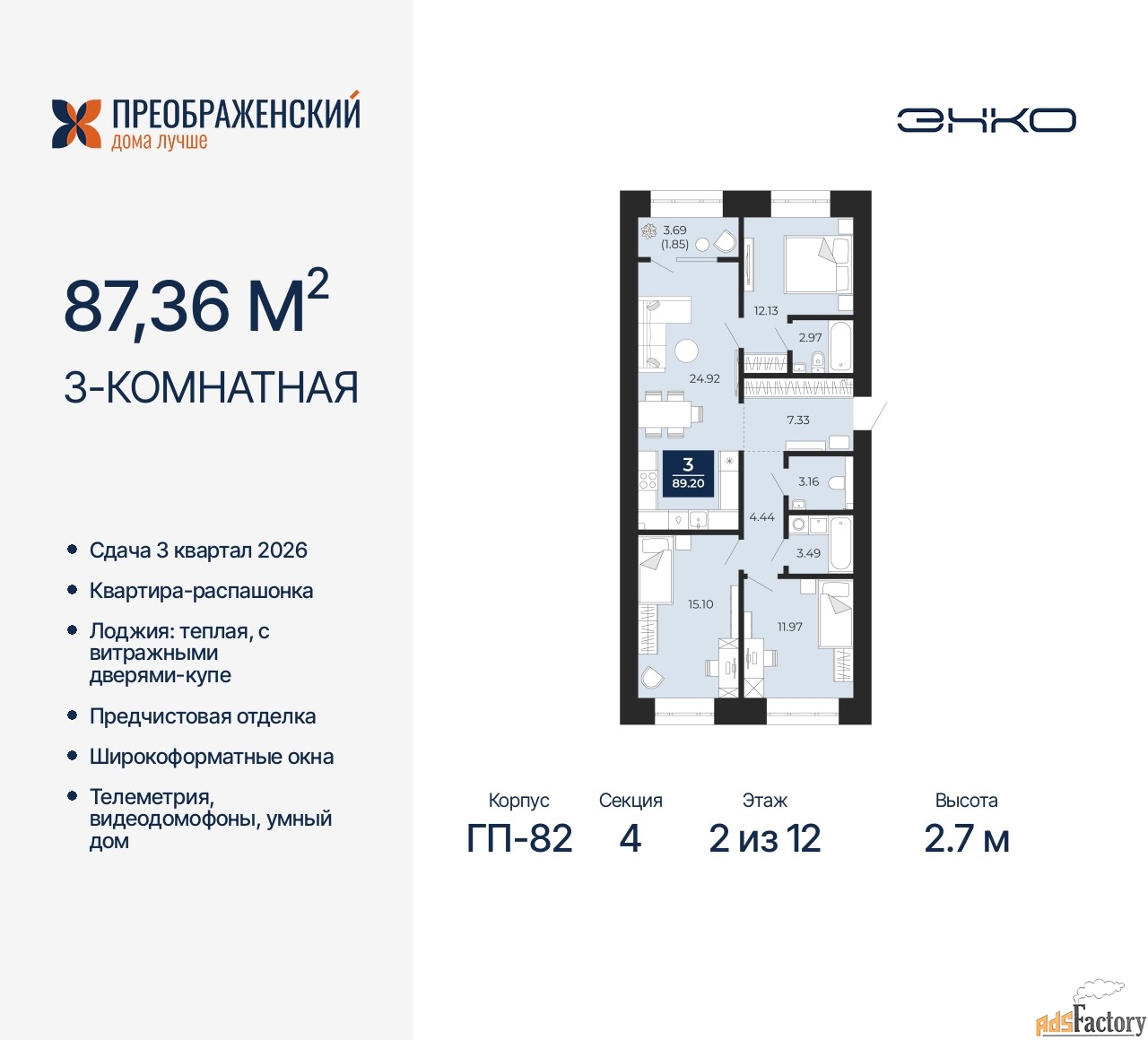 Дом монолитный, многоподъездный, переменной этажности, от 8 до 12 этажей. Квартира находится в 4-й секции высотой 12 этажей в корпусе ГП-82. На этаже 6 квартир. В подъезде 1 пассажирский и 1 грузовой лифт. Окончание строительства - 3 квартал 2026 года. Оформление сделки по договору долевого участия.