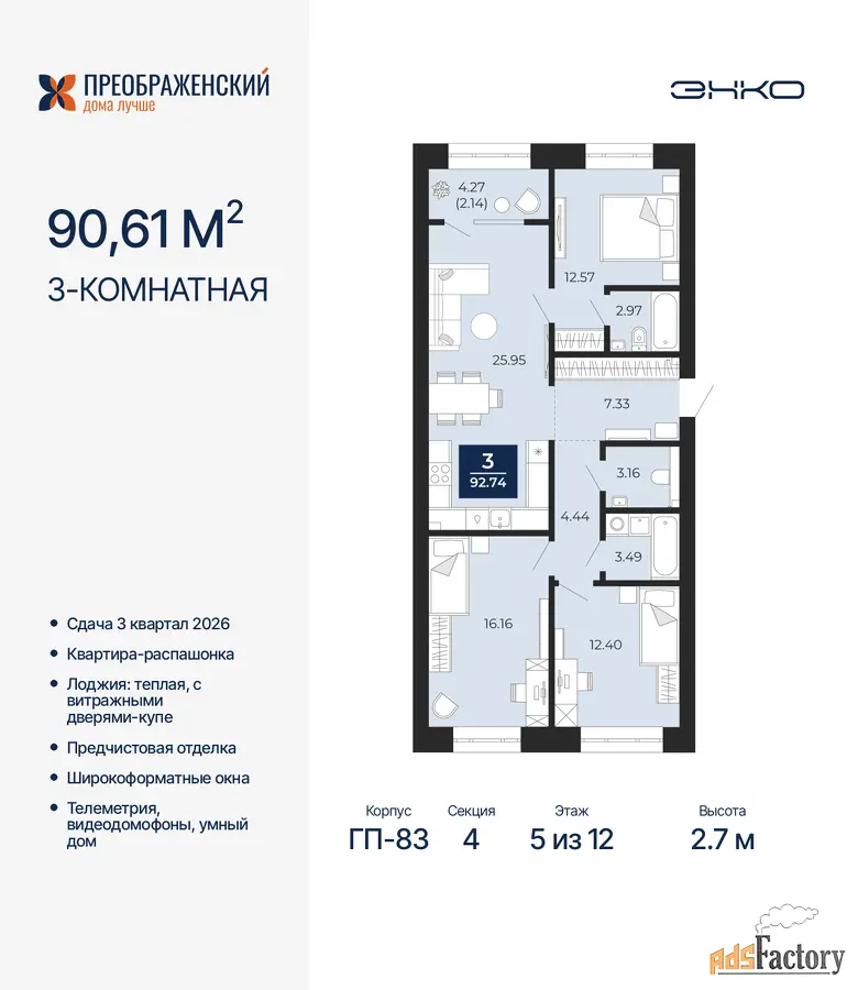 | Высота потолков (м.) | 2.7 |