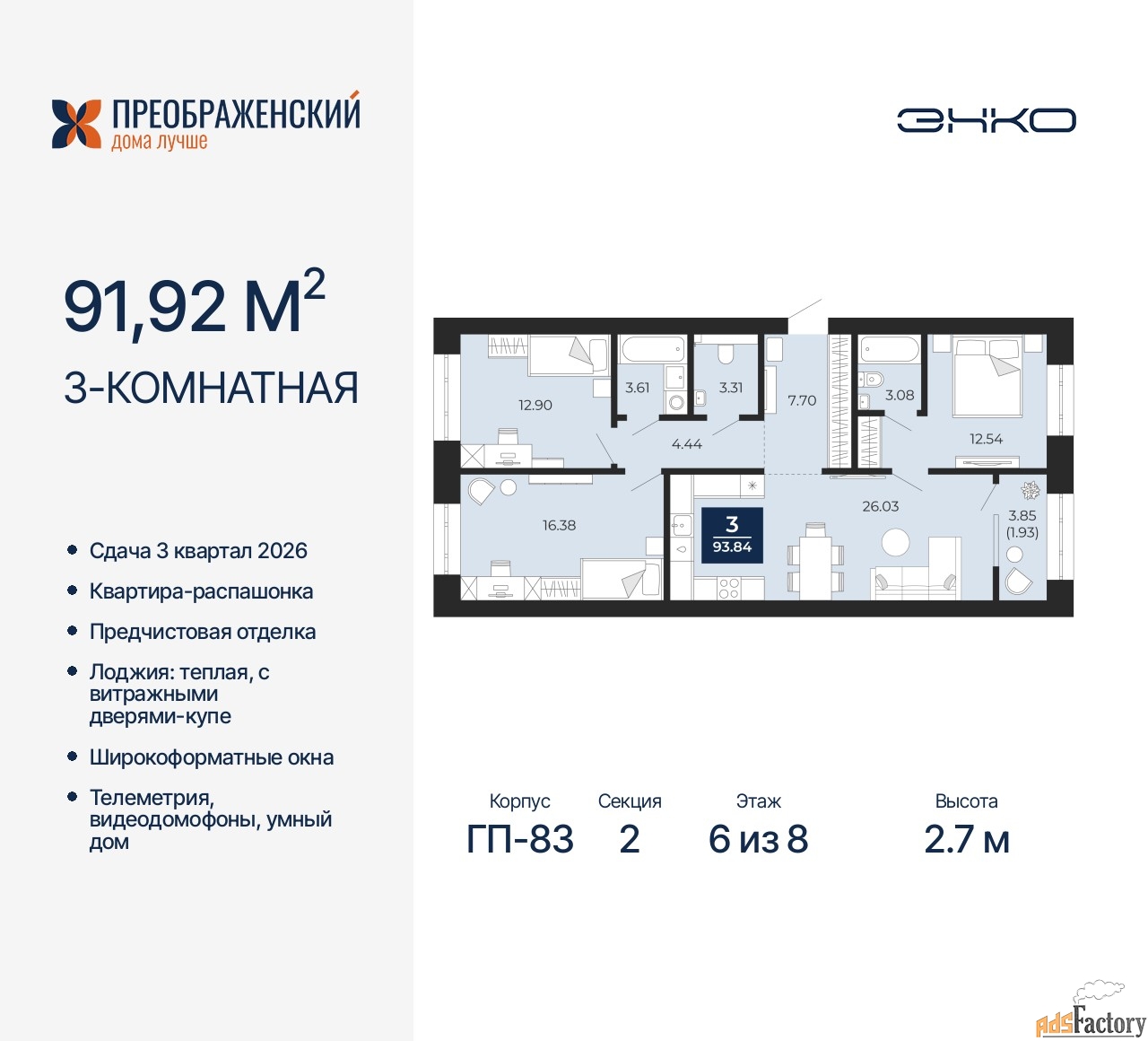 Дом монолитный, многоподъездный, переменной этажности, от 8 до 12 этажей. Квартира находится во 2-й секции высотой 8 этажей в корпусе ГП-83. На этаже 6 квартир. В подъезде 1 грузовой лифт. Начало строительства - 4 квартал 2023 года. Окончание строительства - 3 квартал 2026 года. Оформление сделки по договору долевого участия.