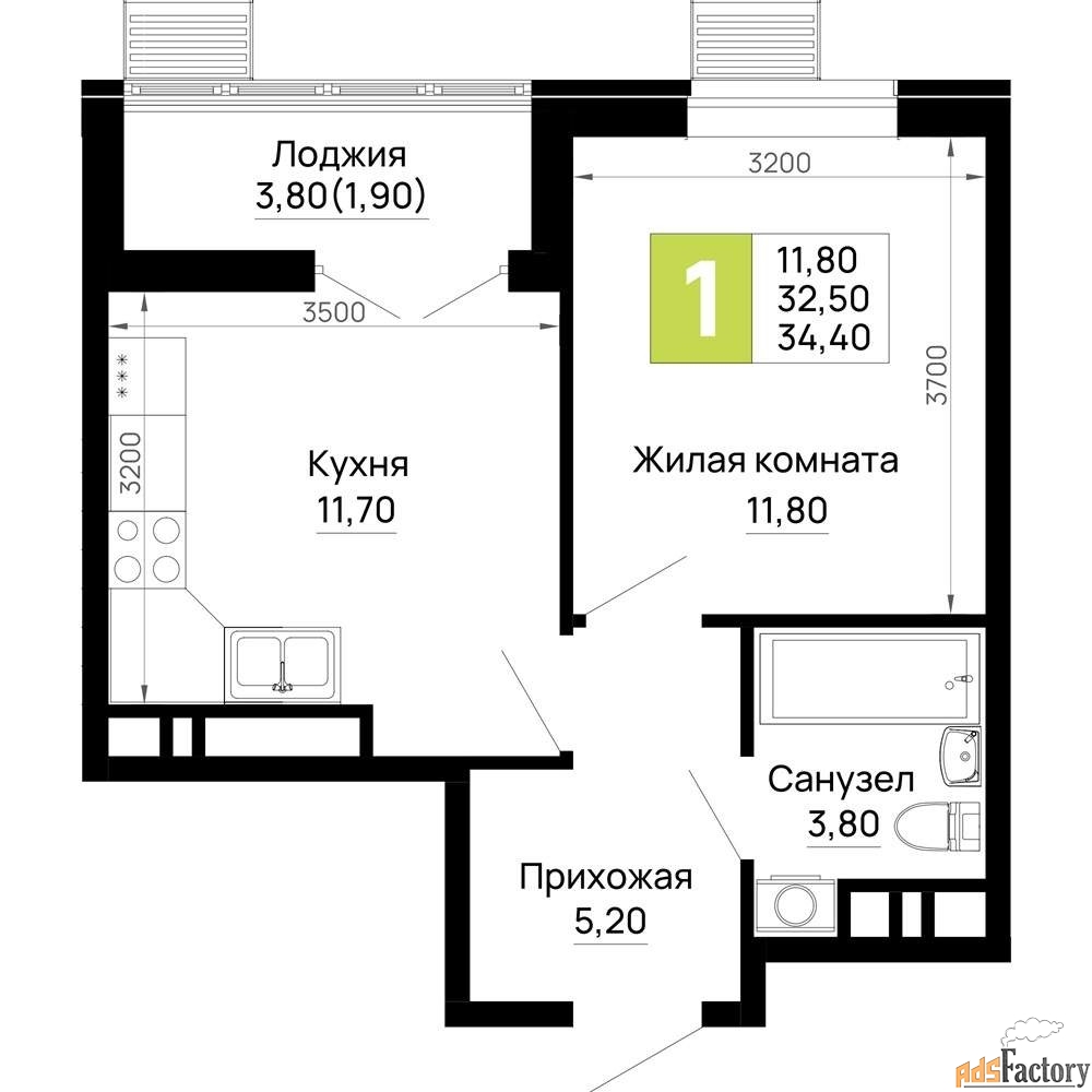 Жилая площадь 11.8 м2, кухня 11.7 м2, черновая отделка, комнаты изолированные.