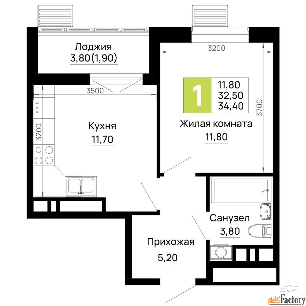 Жилая площадь 11.8 м2, кухня 11.7 м2, черновая отделка, комнаты изолированные.