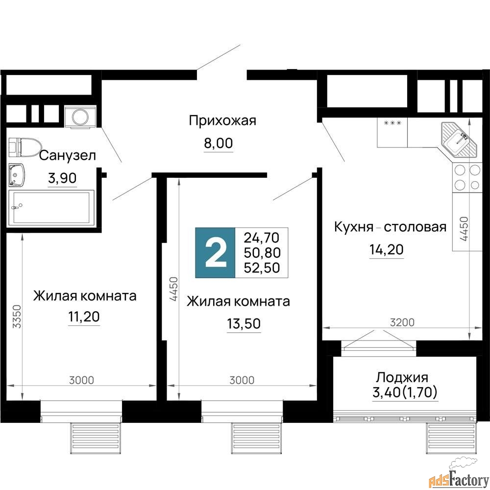 Жилая площадь 24.7 м2, кухня 14.2 м2, черновая отделка.