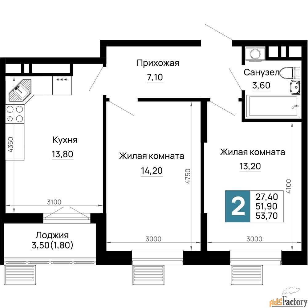 Жилая площадь 27.4 м2, кухня 13.8 м2, черновая отделка.