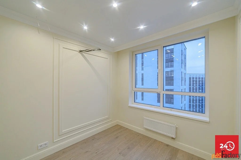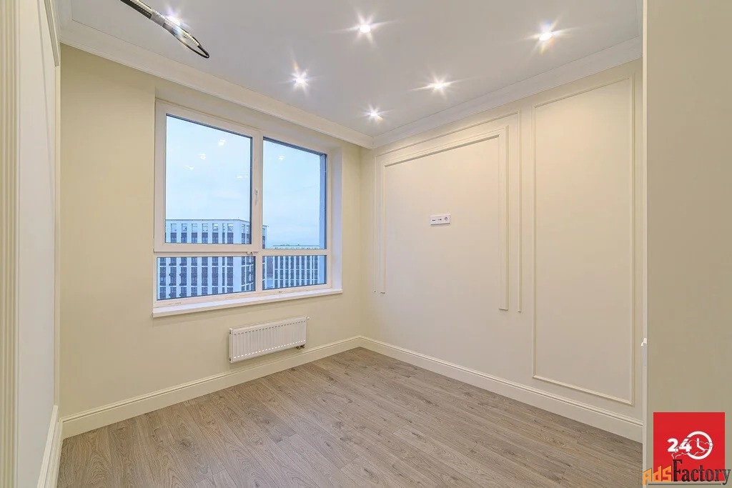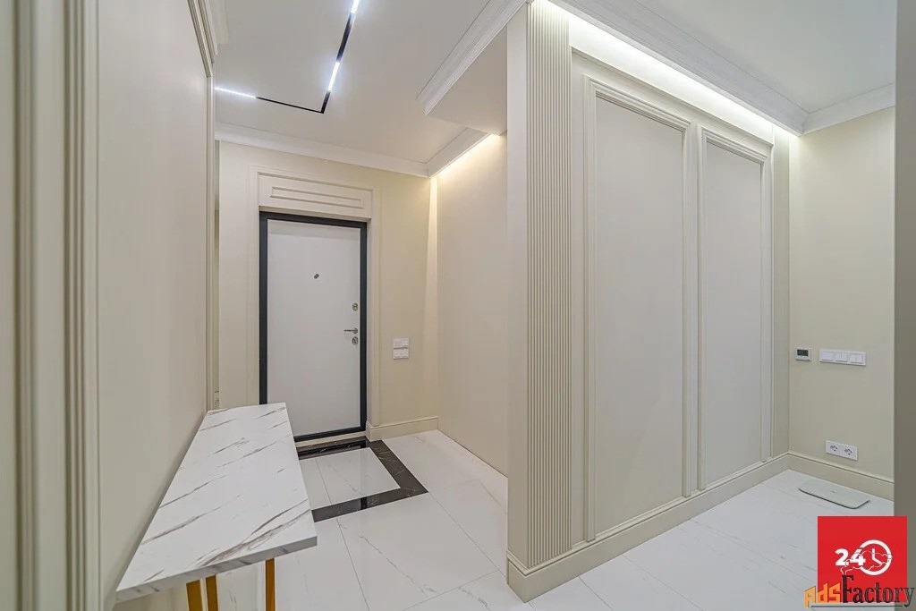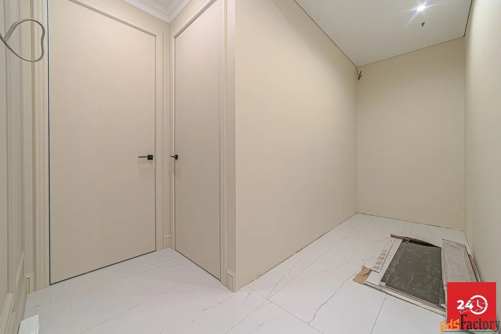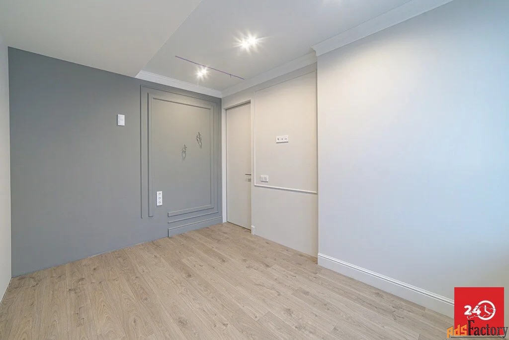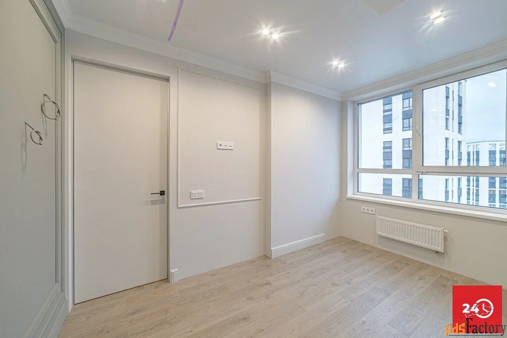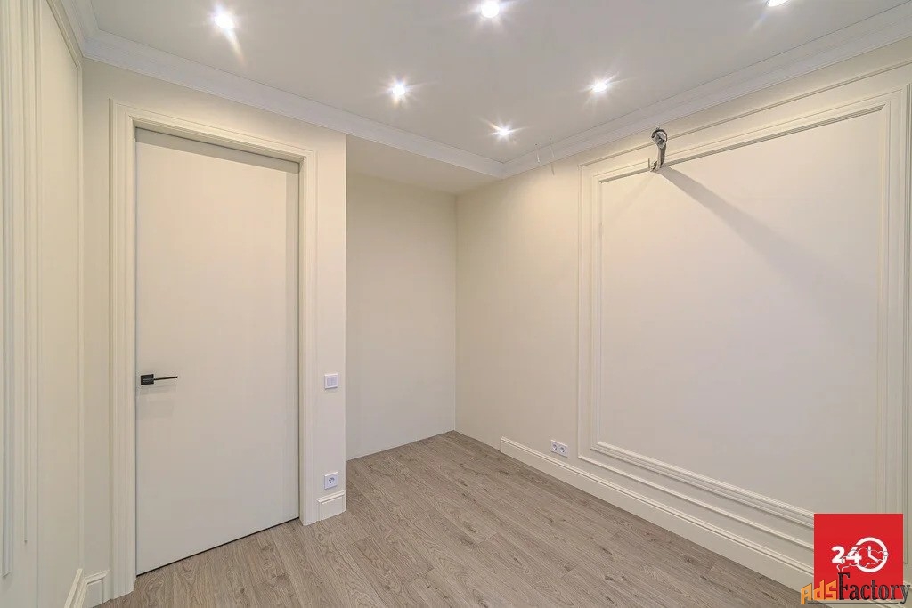 В квартире сделан качественный дизайнерский ремонт, делали для жизни, а не на перепродажу: все стены идеально выровнены и окрашены, на полу – ламинат и керамогранит, смонтирована система теплого пола, санузлы в современном кафеле; натяжные потолки с трековым и точечным освещением, межкомнатные двери скрытого монтажа.