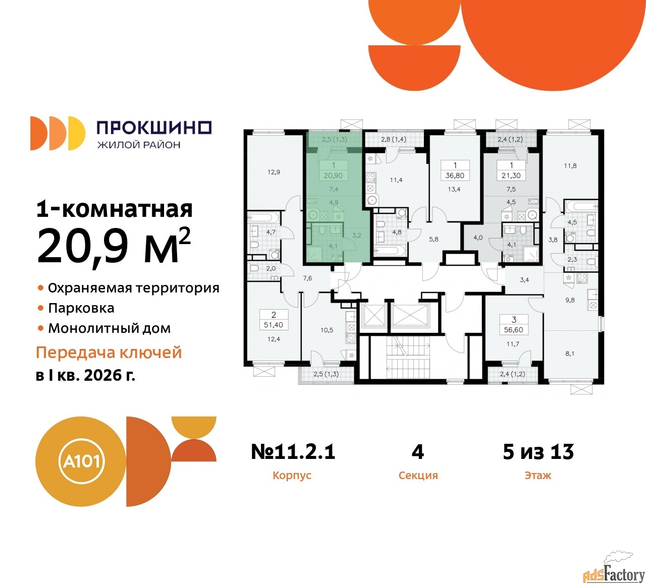 Дом монолитный, черырехподъездный, высотой 13 этажей. Квартира находится в 4-й секции в корпусе 11.2.1. На этаже 5 квартир. В подъезде 1 пассажирский и 1 грузовой лифт. Начало строительства - 3 квартал 2023 года. Окончание строительства - 1 квартал 2026 года. Оформление сделки по договору долевого участия.