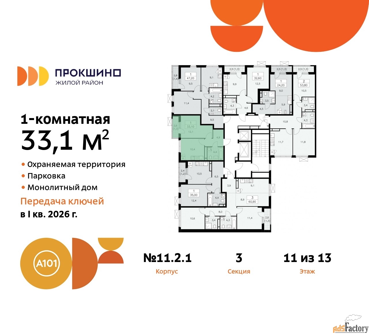 Дом монолитный, черырехподъездный, высотой 13 этажей. Квартира находится в 3-й секции в корпусе 11.2.1. На этаже 7 квартир. В подъезде 1 пассажирский и 1 грузовой лифт. Начало строительства - 3 квартал 2023 года. Окончание строительства - 1 квартал 2026 года. Оформление сделки по договору долевого участия.