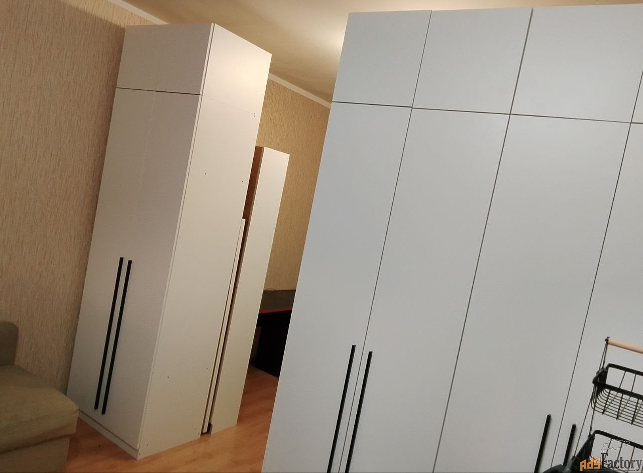 Отделана зона кухни с большими вместительными шкафами и есть еще зона для работы рядом с кроватью.