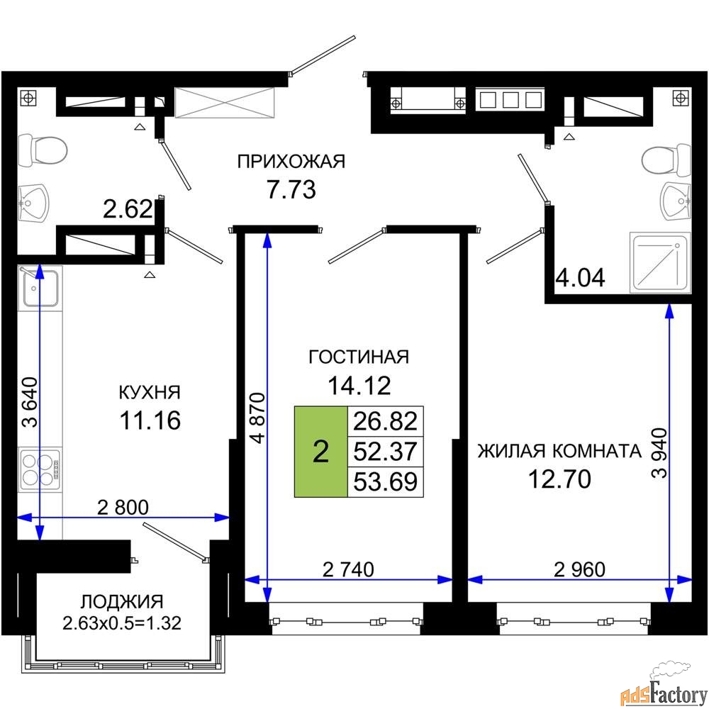 Жилая площадь 26.82 м2, кухня 11.16 м2, предчистовая отделка.