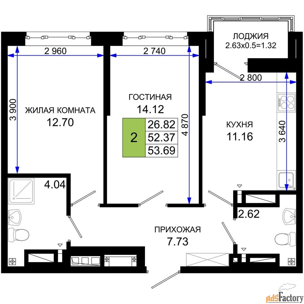 Жилая площадь 26.82 м2, кухня 11.16 м2, предчистовая отделка.