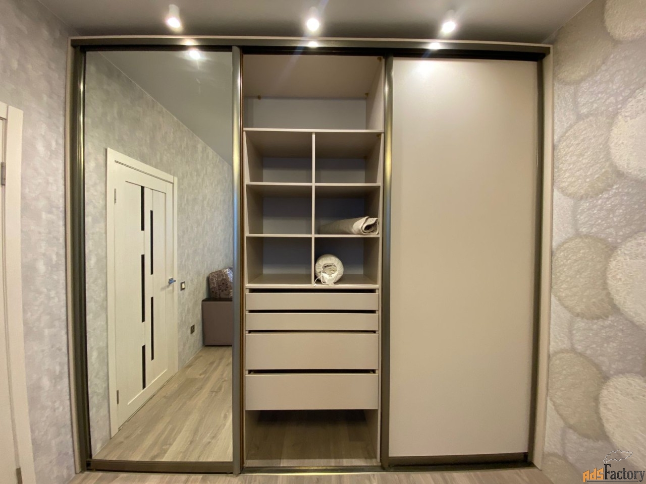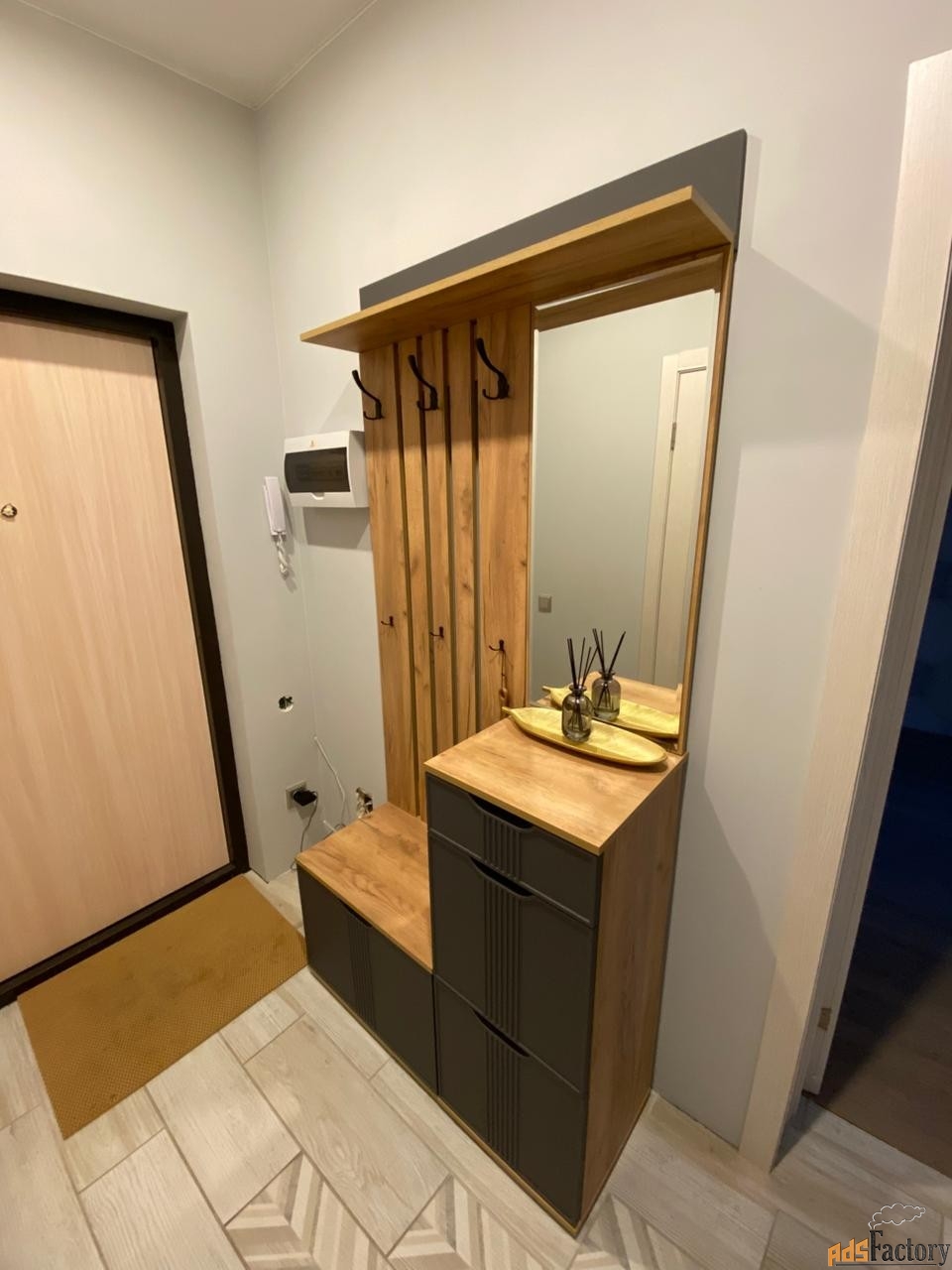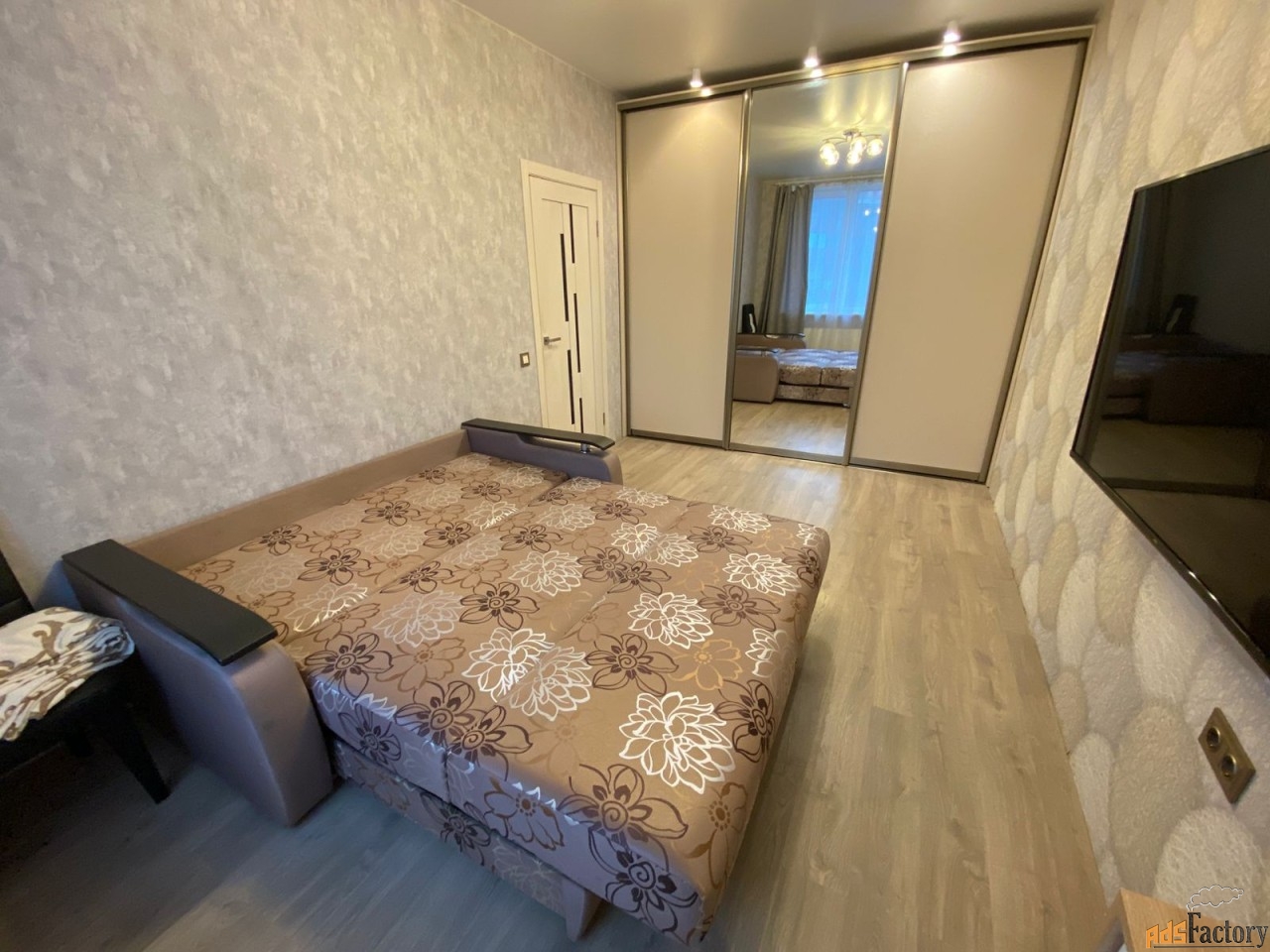 В комнате вместительный шкаф-купе, двуспальный диван-«евро-книжка» (1,60х2,00), большой ТВ smаrt, небольшой комод и стул. Есть сушилка, подушки, одеяло, матрас. Гладильную доску купят.