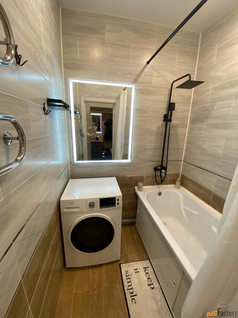 Санузел в квартире раздельный, ванна, большое зеркало с подсветкой, стиральная машина, кафель; в прихожей-вешалка.