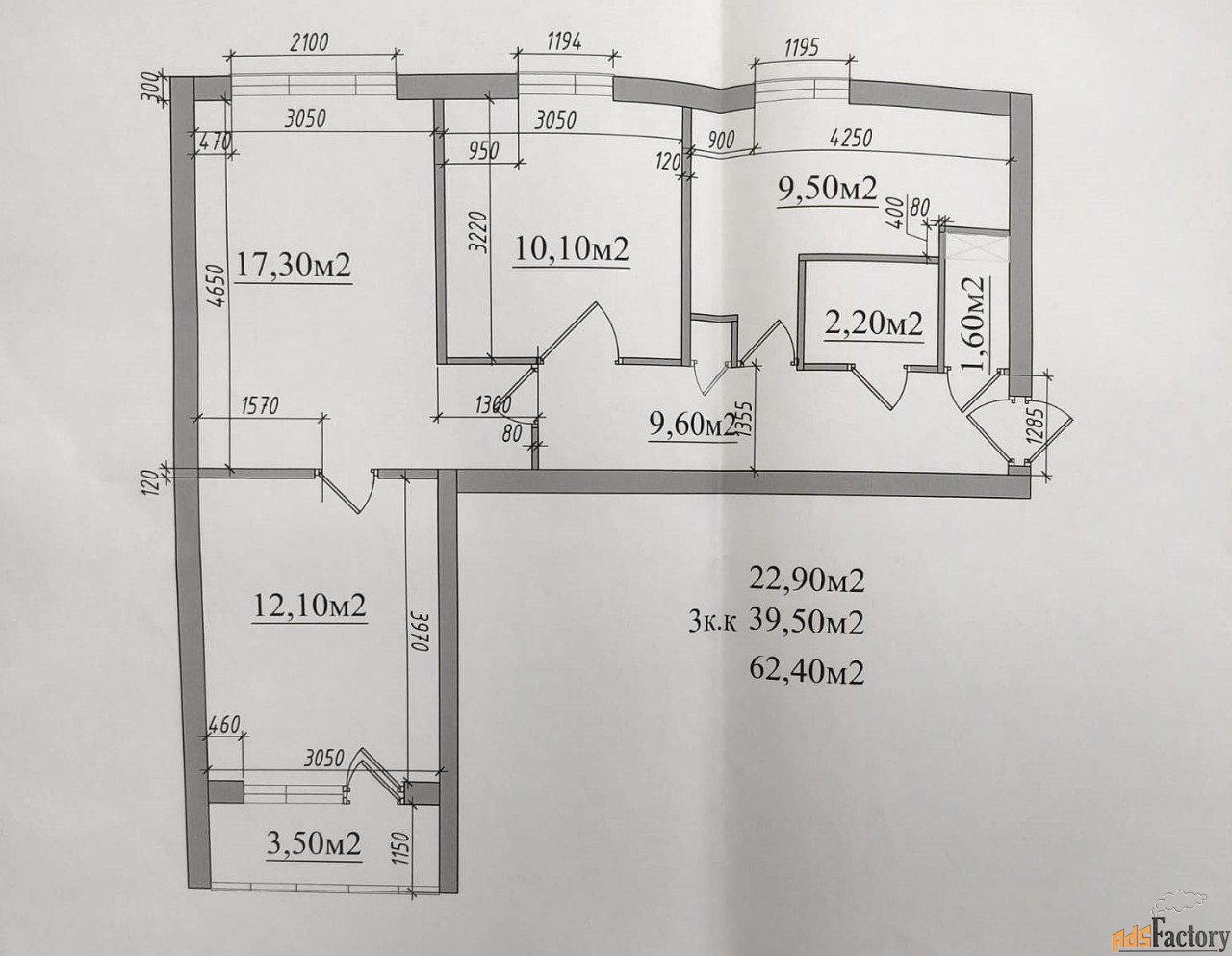 Площади: общая - 62,4 кв.м; жилая - 39,5 кв.м; кухня - 9,5 кв.м. Комнаты: изолированная - 10,1 кв.м; смежные - 12,1 с выходом на лоджию + 17,3 кв.м.