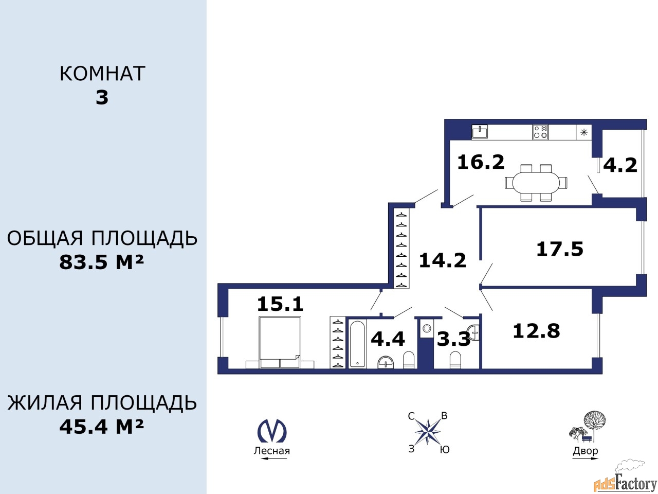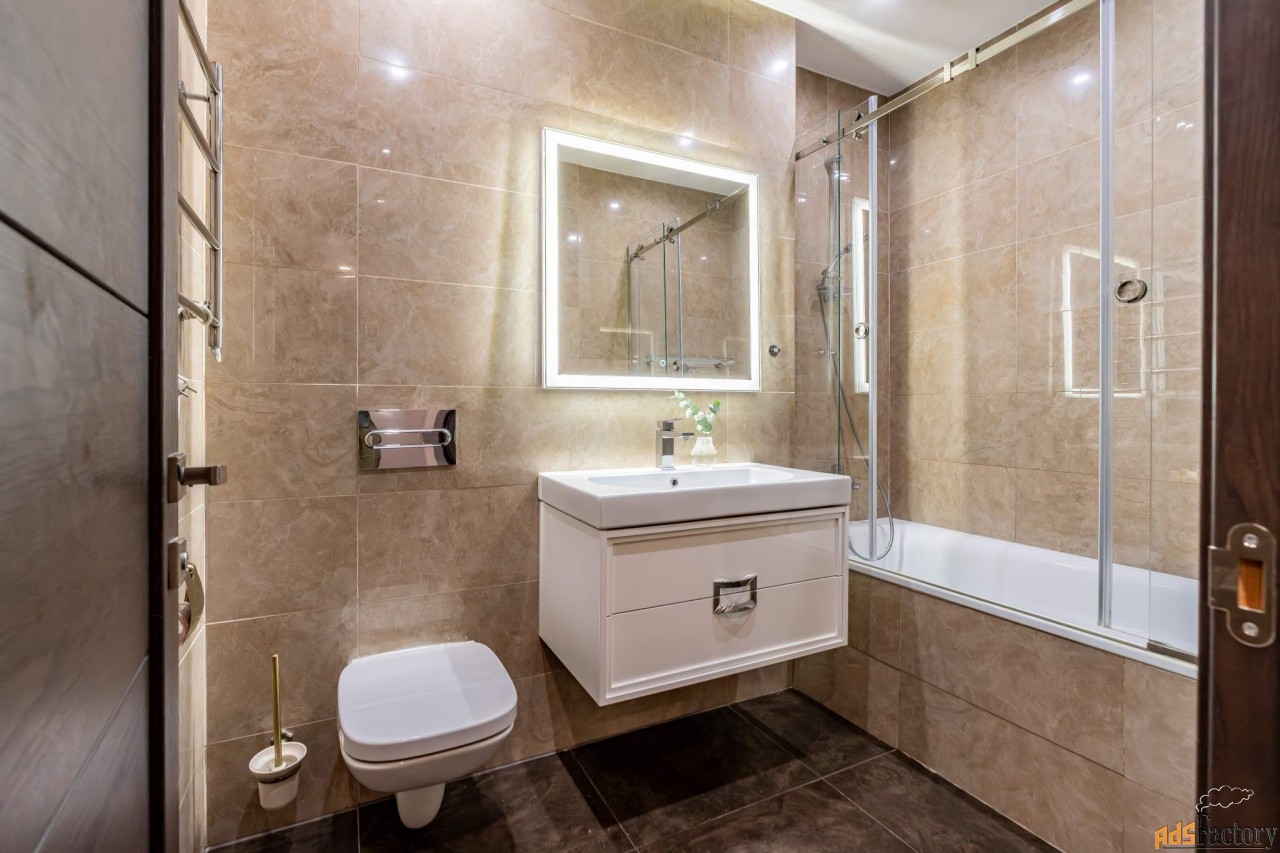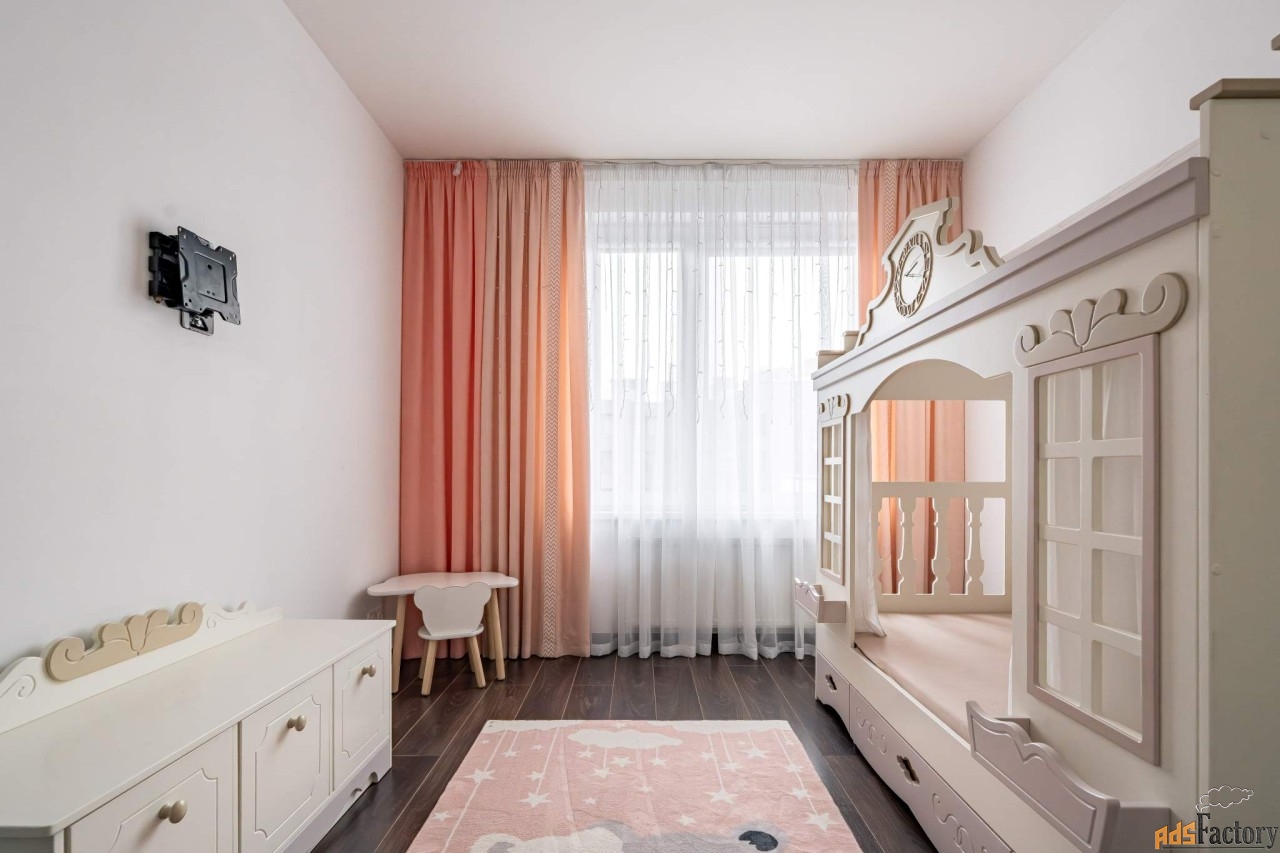 Квартира находится в современном комплексе в архитектурном стиле AECOM. Дизайнерские парадные, лифты OTIS, на первых этажах — магазины и сервисы. Закрытая территория, видеонаблюдение, контроль доступа. Во дворах — зоны отдыха, детские площадки, озеленение.