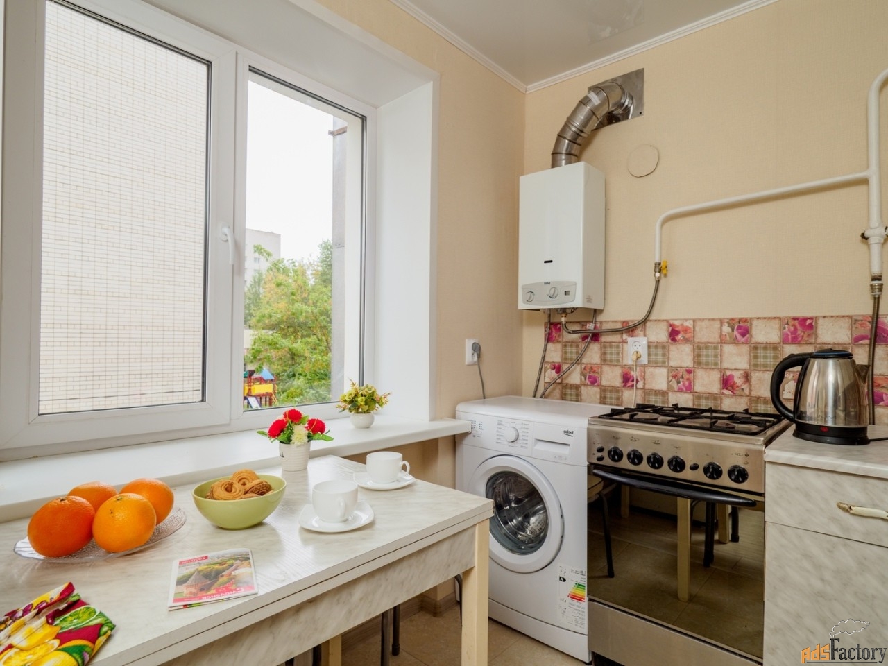 Компактная кухня оборудована современной мебелью и всей нужной для длительного проживания бытовой техникой. В распоряжении гостей квартиры полный комплект посуды и кухонной утвари на четыре персоны, чтобы чувствовать себя как дома и готовить привычный рацион по своему вкусу.