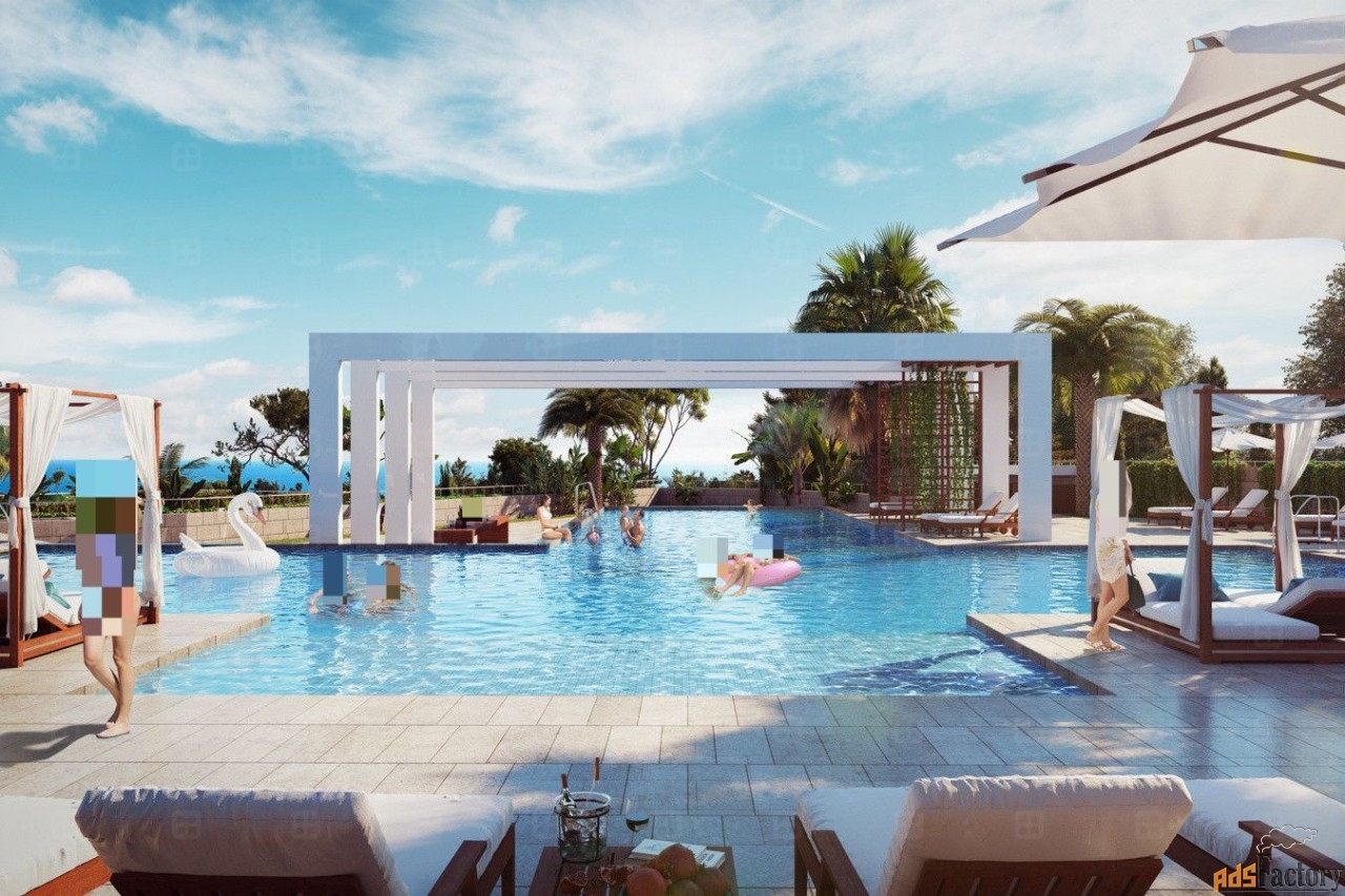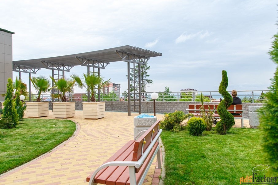 Большой закрытый жилой комплекс «Морская Симфония» с большим открытым бассейном, смотровой площадкой с видом на море, детские площадки, фонтан с подсветкой, теннисный корт, спортивные площадки, фитнес.