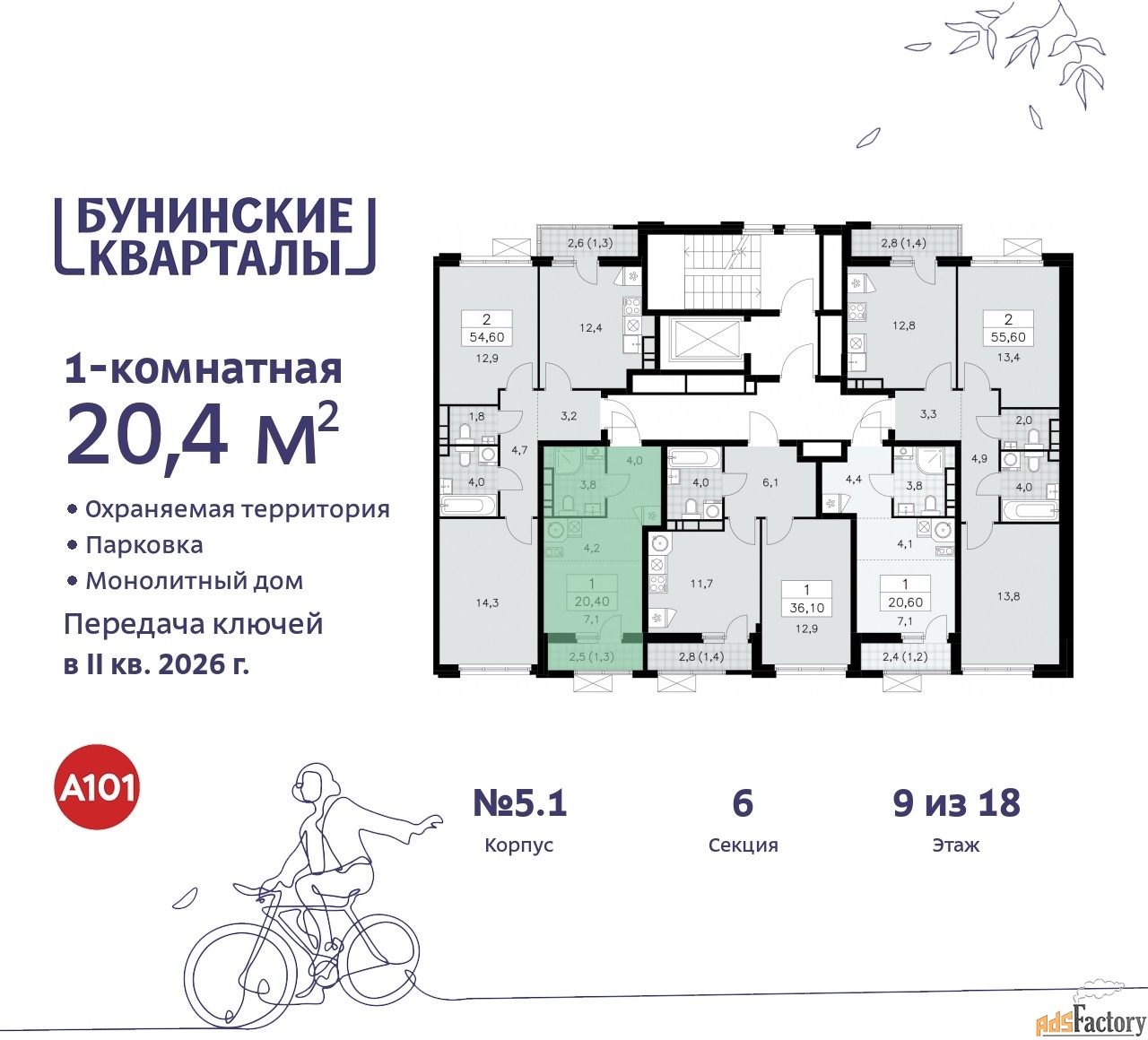 Дом монолитный, многоподъездный, переменной этажности, от 9 до 18 этажей. Квартира находится в 6-й секции высотой 9 этажей в корпусе 5.1. На этаже 5 квартир. В подъезде 1 грузовой лифт. Начало строительства - 4 квартал 2023 года. Окончание строительства - 2 квартал 2026 года. Оформление сделки по договору долевого участия.