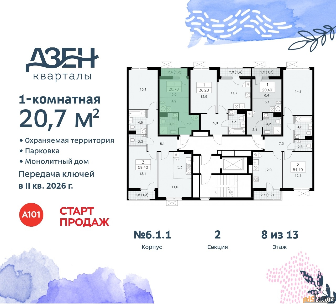 Дом монолитный, многоподъездный, переменной этажности, от 9 до 13 этажей. Квартира находится во 2-й секции высотой 9 этажей в корпусе 6.1.1. На этаже 5 квартир. В подъезде 1 грузовой лифт. Начало строительства - 4 квартал 2023 года. Окончание строительства - 2 квартал 2026 года. Оформление сделки по договору долевого участия.