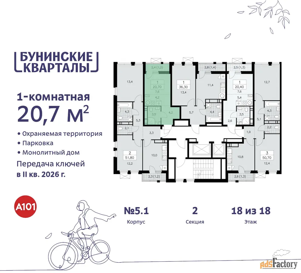 Дом монолитный, многоподъездный, переменной этажности, от 9 до 18 этажей. Квартира находится во 2-й секции высотой 18 этажей в корпусе 5.1. На этаже 5 квартир. В подъезде 1 пассажирский и 1 грузовой лифт. Начало строительства - 4 квартал 2023 года. Окончание строительства - 2 квартал 2026 года. Оформление сделки по договору долевого участия.