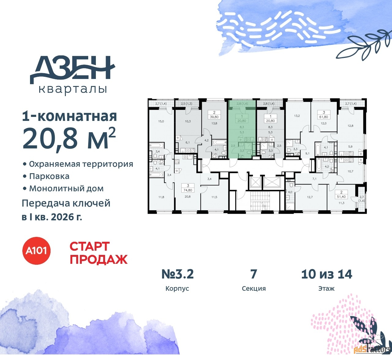 Дом монолитный, многоподъездный, переменной этажности, от 9 до 14 этажей. Квартира находится в 6-й секции высотой 14 этажей в корпусе 3.2. На этаже 6 квартир. В подъезде 1 пассажирский и 1 грузовой лифт. Начало строительства - 3 квартал 2023 года. Окончание строительства - 1 квартал 2026 года. Оформление сделки по договору долевого участия.