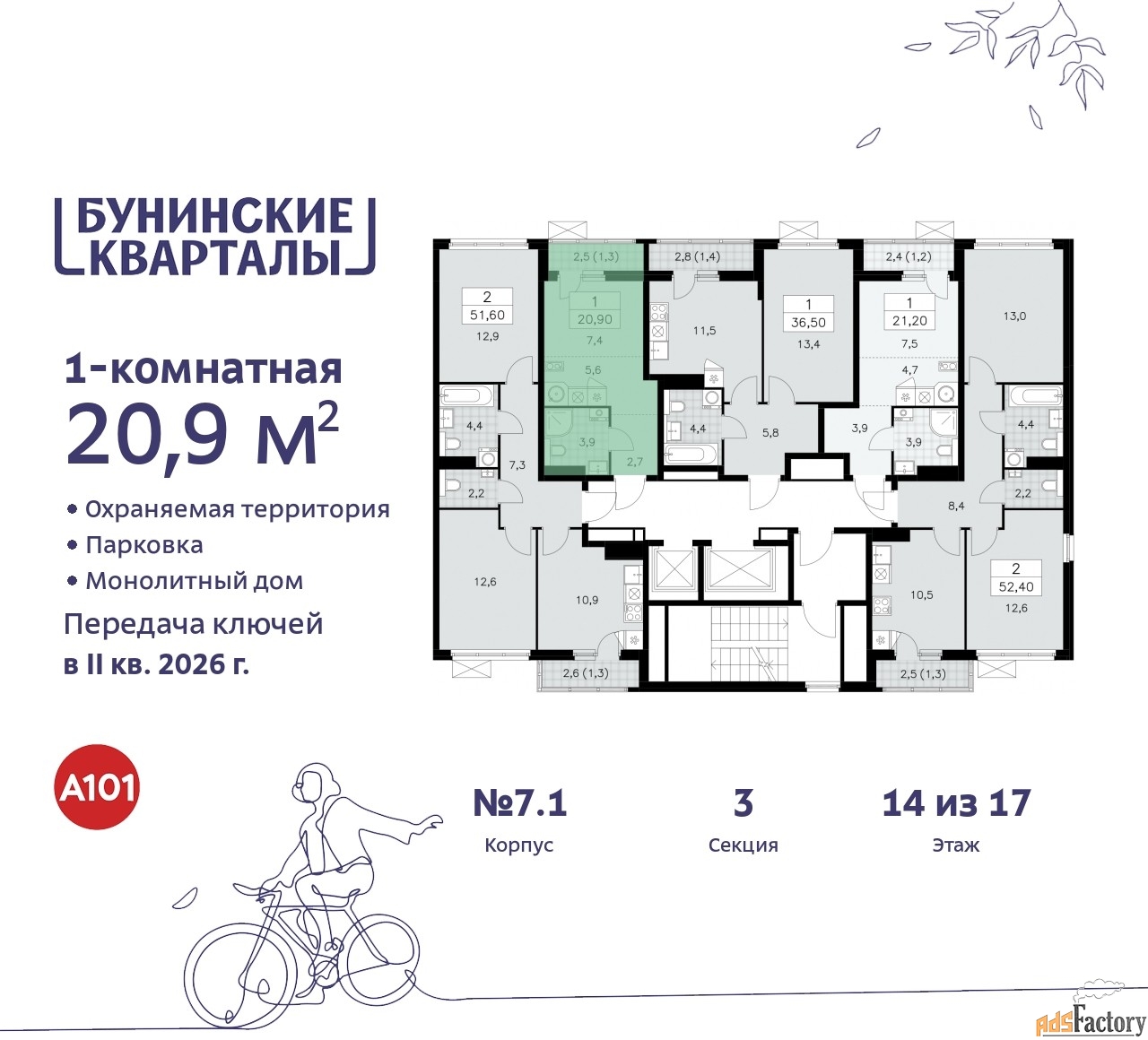 Дом монолитный, многоподъездный, переменной этажности, от 9 до 17 этажей. Квартира находится в 3-й секции высотой 17 этажей в корпусе 7.1. На этаже 5 квартир. В подъезде 1 пассажирский и 1 грузовой лифт. Начало строительства - 4 квартал 2023 года. Окончание строительства - 2 квартал 2026 года. Оформление сделки по договору долевого участия.