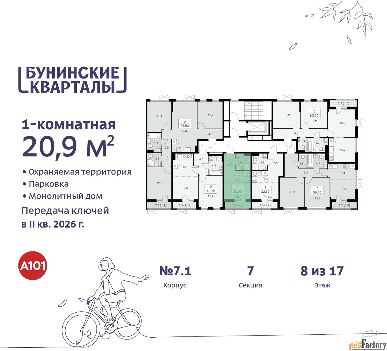 Дом монолитный, многоподъездный, переменной этажности, от 9 до 17 этажей. Квартира находится в 7-й секции высотой 9 этажей в корпусе 7.1. На этаже 6 квартир. В подъезде 1 грузовой лифт. Начало строительства - 4 квартал 2023 года. Окончание строительства - 2 квартал 2026 года. Оформление сделки по договору долевого участия.